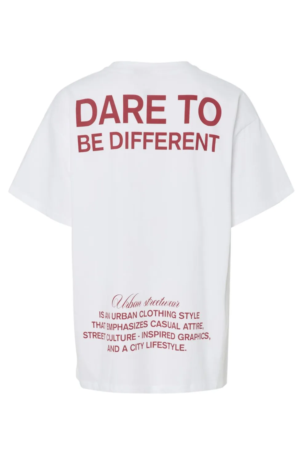 Hvid t-shirt fra Pieces med teksten For Everyday Wear foran og DARE TO BE DIFFERENT bagpå. T-shirten har en oversize pasform med rund halsudskæring og korte ærmer.