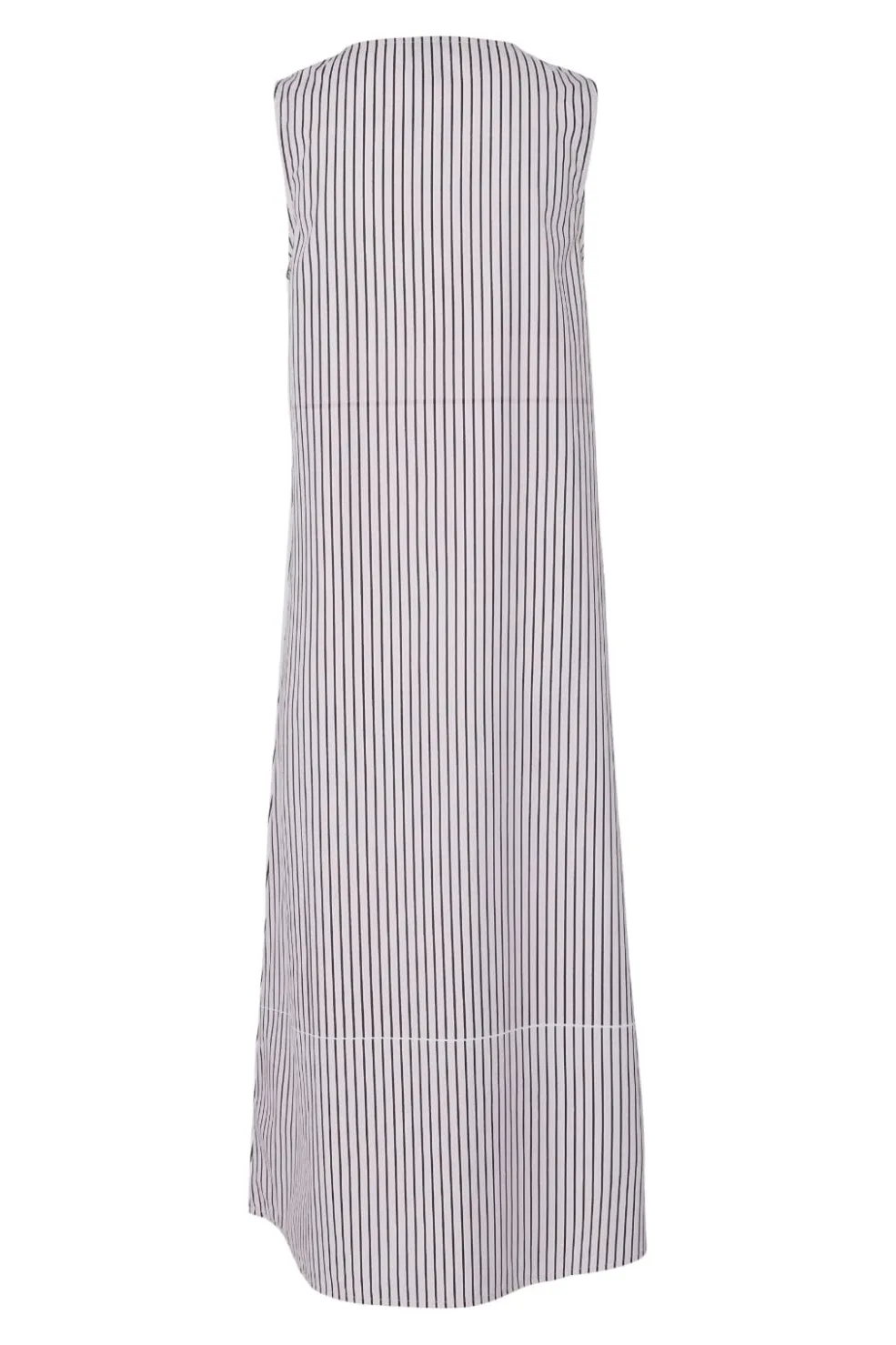 Ærmeløs midi-kjole fra Pieces med striber i pink og hvid. Kjolen har et løst snit og en V-udskæring med bindedetalje ved halsen.