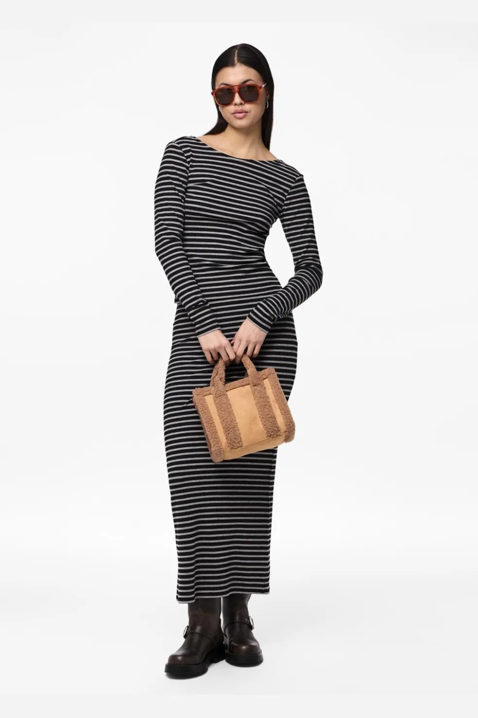Stribet top fra Pieces i sort og lysegrå. Toppen har en rund halsudskæring og lange ærmer. Det stribede mønster går hele vejen rundt, og stoffet er lavet i en blød jersey-kvalitet.