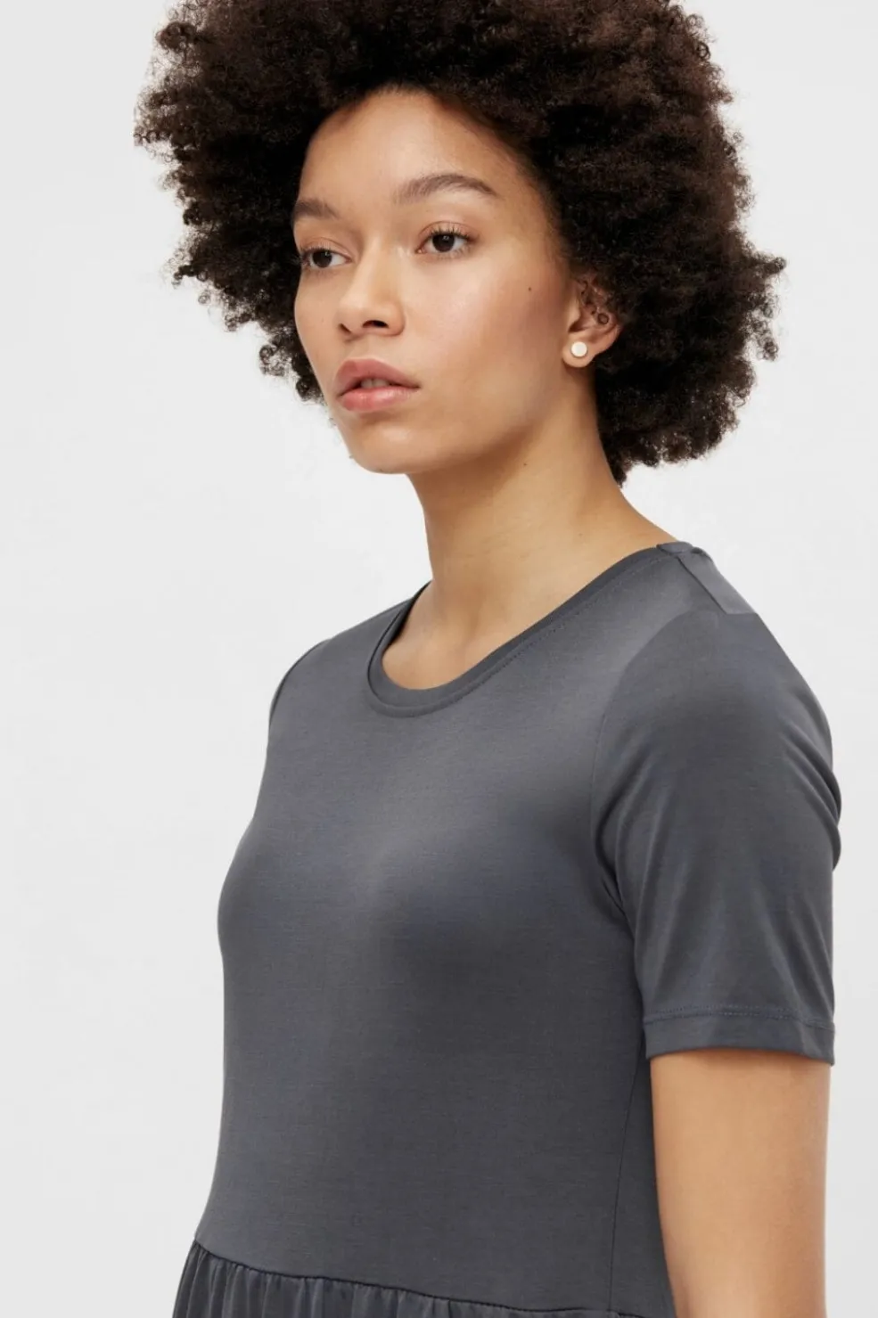 Knælang kjole fra Pieces i ombre blå med flæsedetaljer. Kjolen har korte ærmer og en rund halsudskæring, der giver et rent og enkelt udtryk.