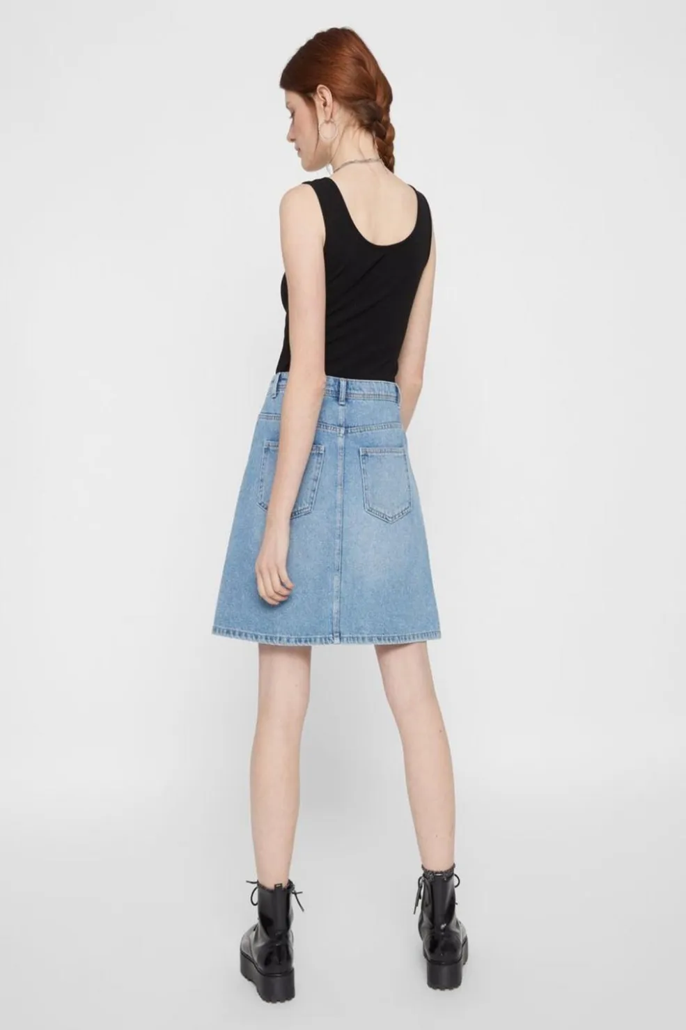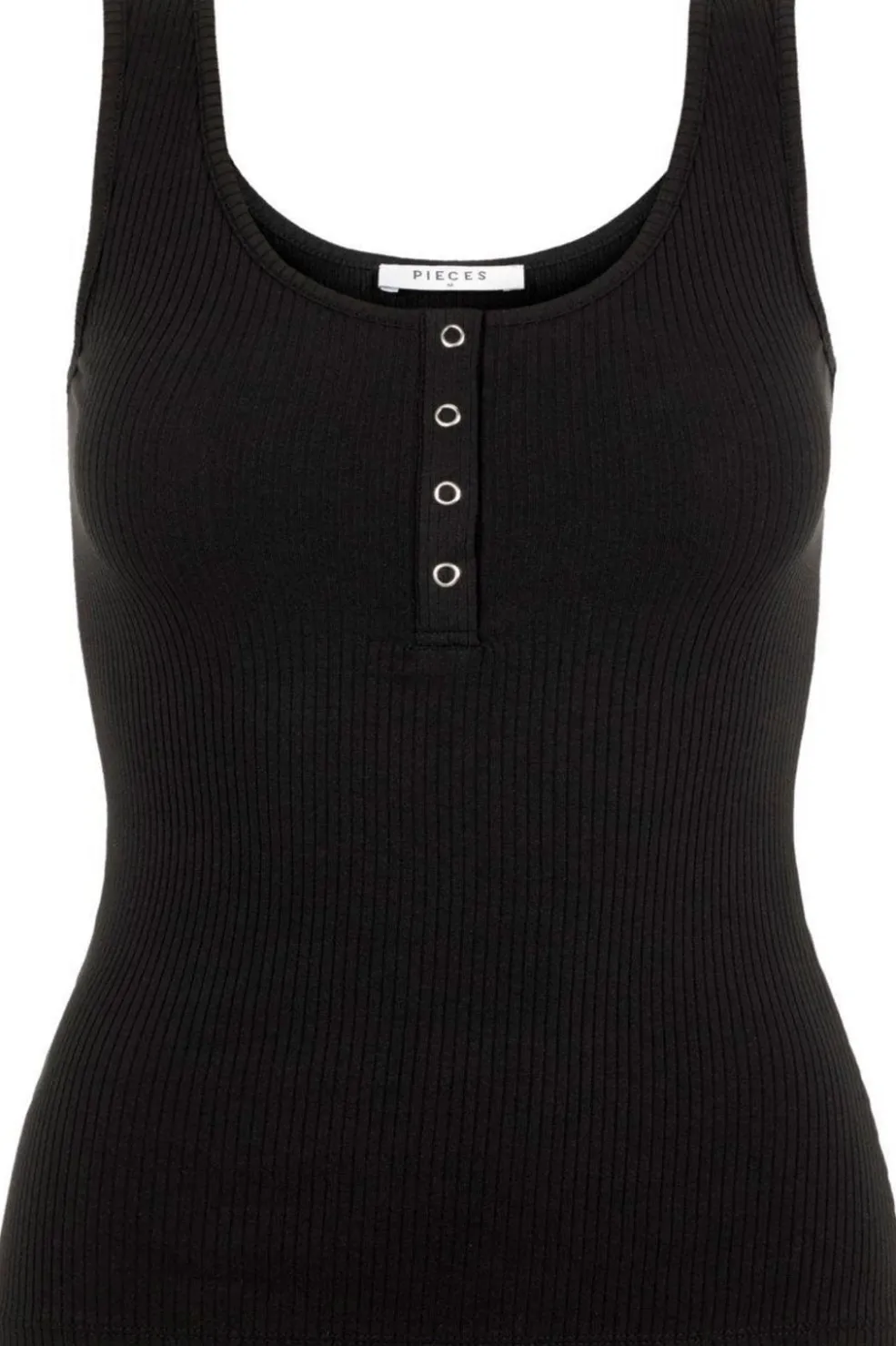 Sort tanktop fra Pieces i ribstof. Toppen har en rund halsudskæring og fire trykknapper foran. Den er fremstillet i en blød bomuldsblanding med stretch.
