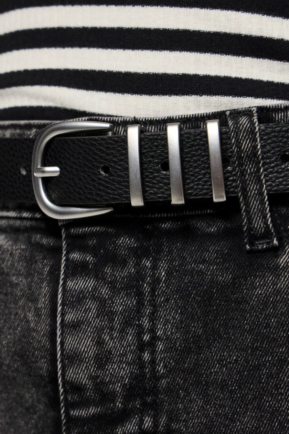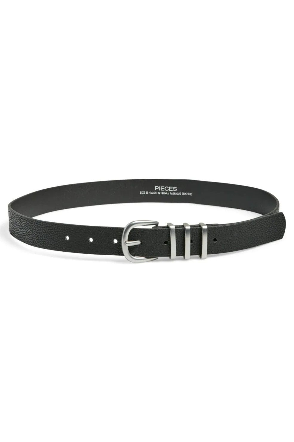 Sort bælte fra Pieces med struktureret overflade og sølvfarvet spænde. Bæltet har tre metalholdere og en klassisk spænde-lukning, der giver et praktisk design.