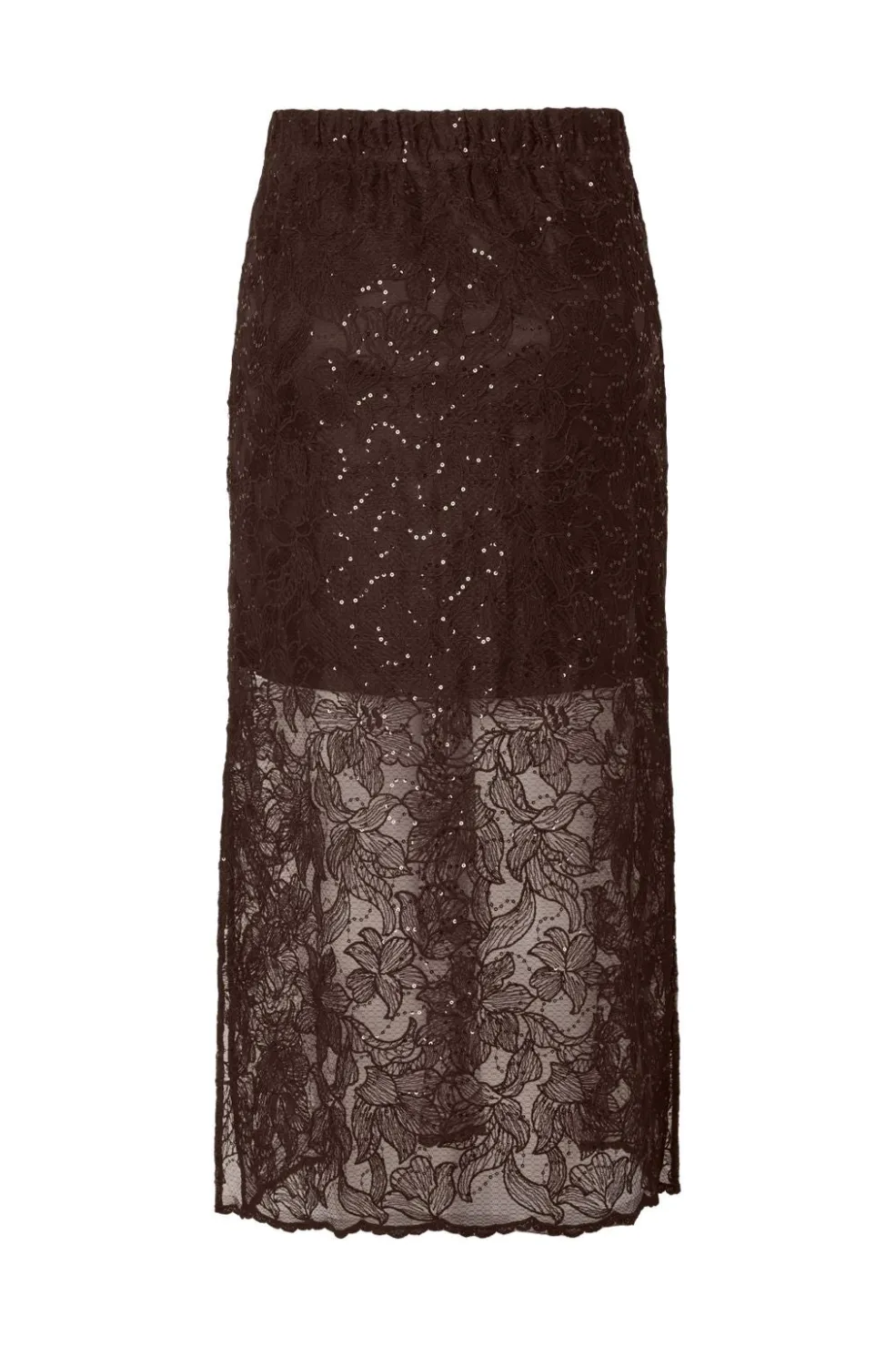 Nederdel fra Pieces i brun med små, skinnende pailletter og gennemsigtig blondekant nederst. Det blomstrede mønster giver nederdelen et feminint udtryk.