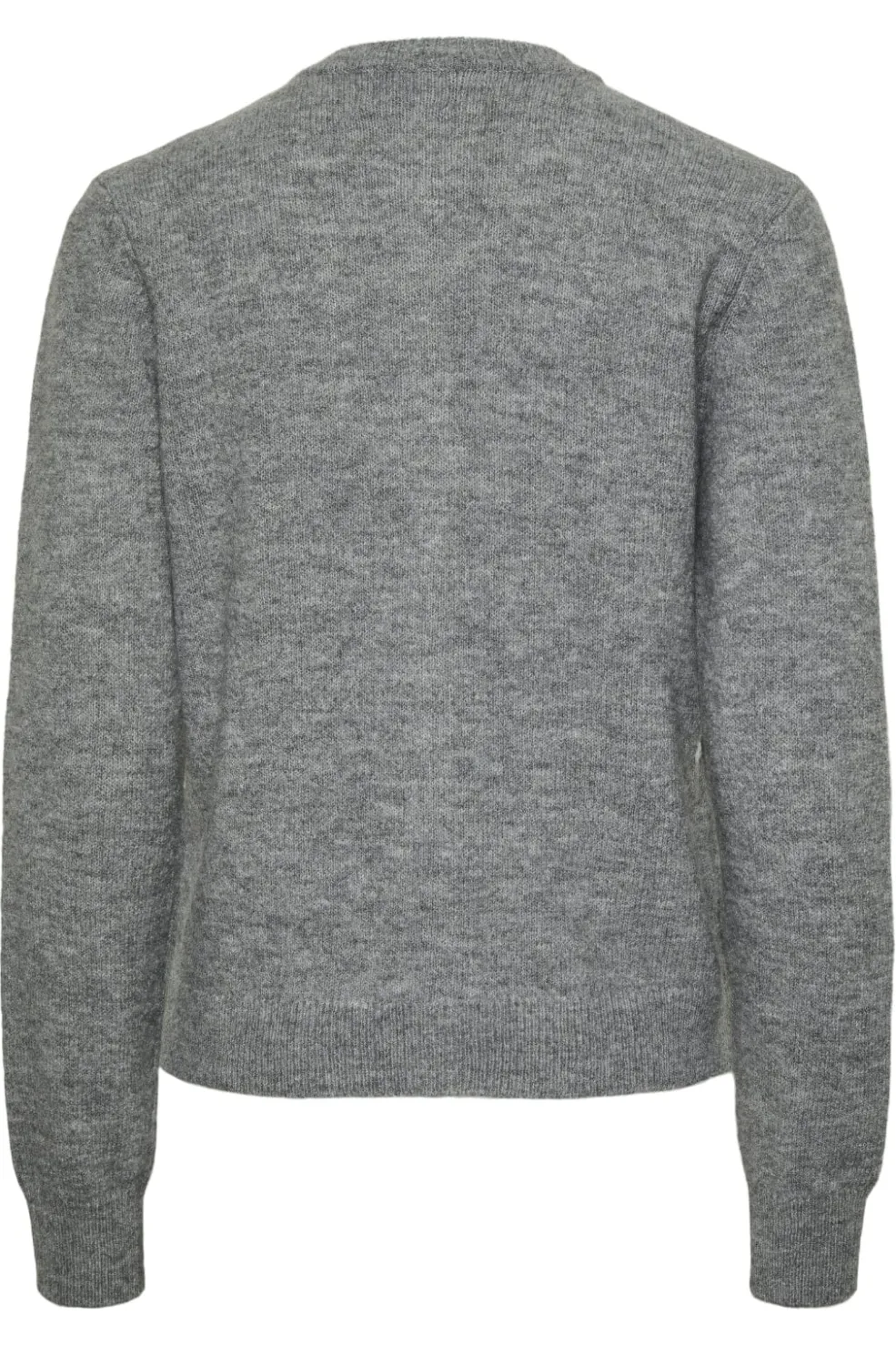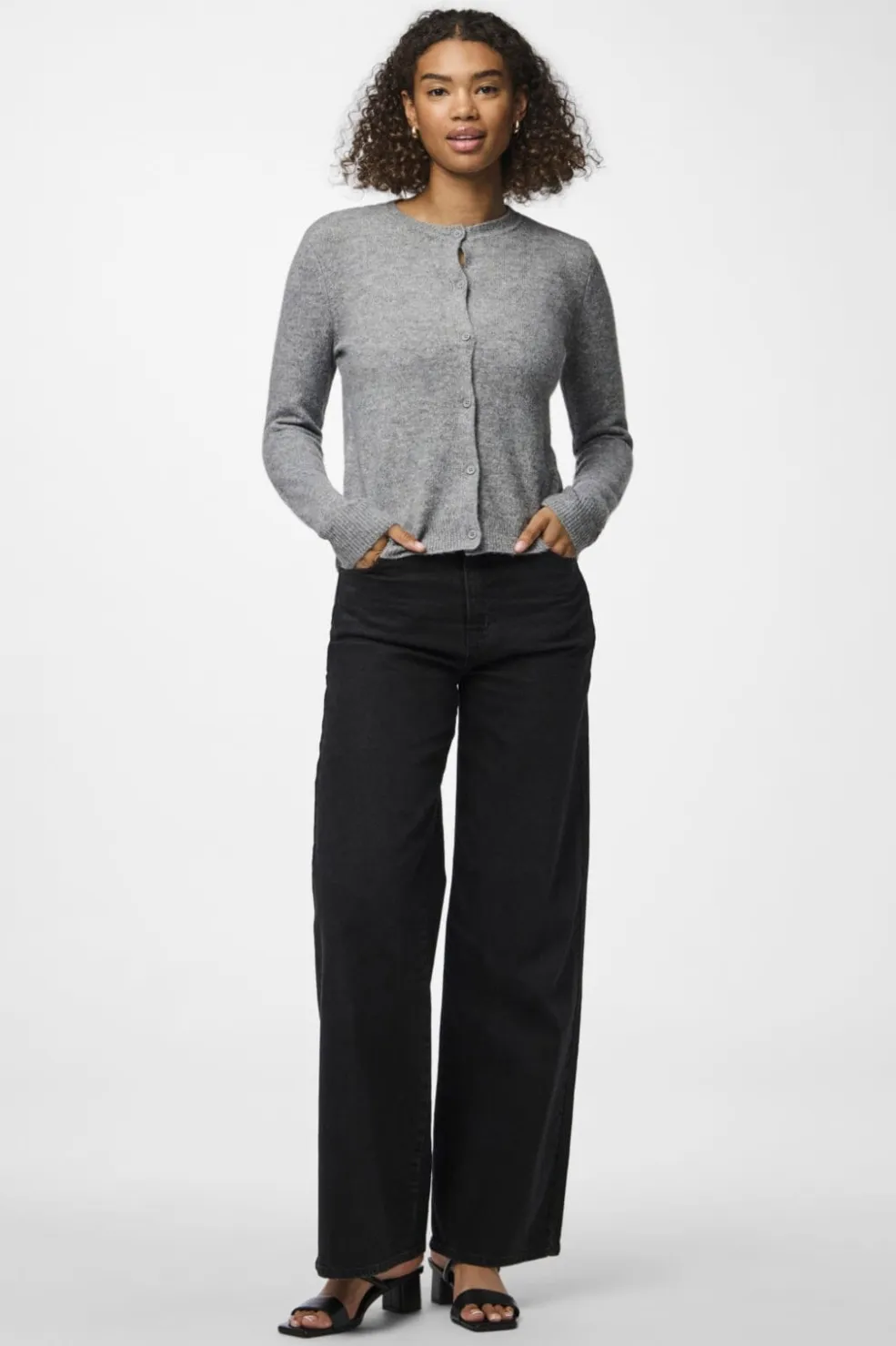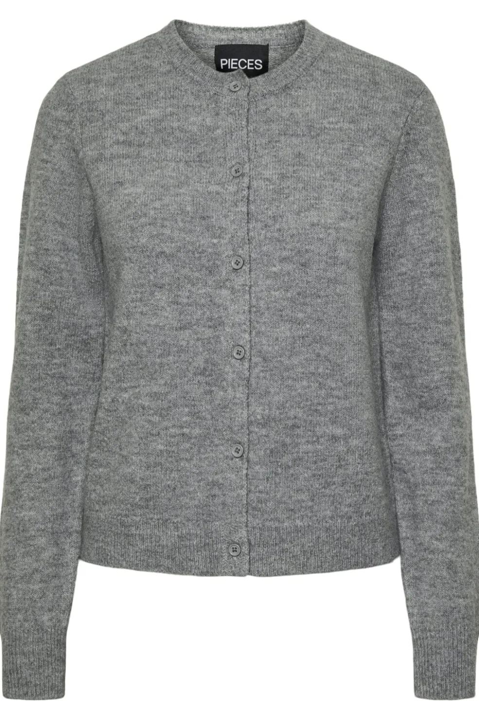 Grå cardigan fra Pieces i fladstrik med rund halsudskæring. Cardiganen har lange ærmer med ribbede manchetter og knaplukning foran.