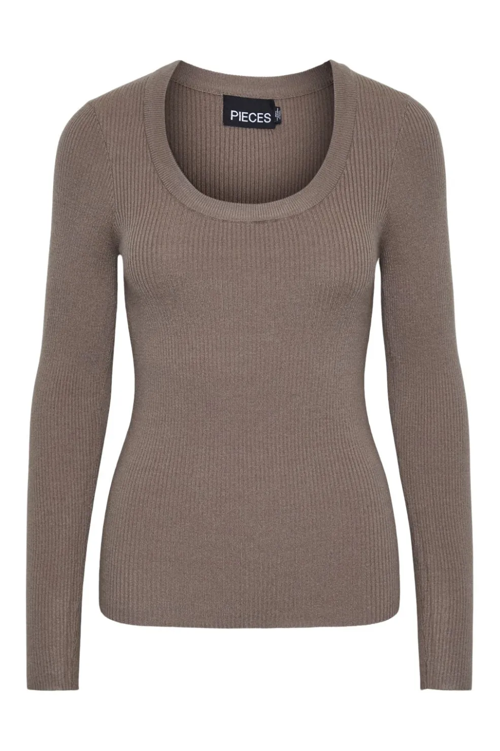 Brun strikbluse fra Pieces i ribstrik med U-halsudskæring og lange ærmer. Toppen har en tætsiddende pasform med synlige ribber på både for- og bagside.