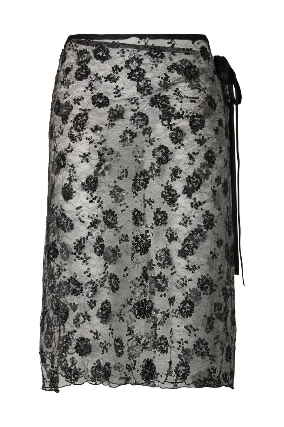 Sort sarong fra Pieces, lavet af gennemsigtig blonde med et blomstermønster. Sarongen har sorte pailletter og en bindesnor i taljen.