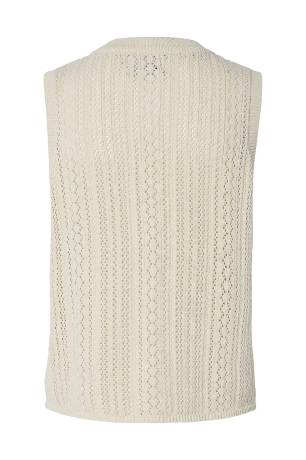 Ærmeløs strikbluse fra Pieces i en lys birch-farve. Blusen har et struktureret strikmønster med lodrette linjer og diamantformer, rund halsudskæring og regular fit.