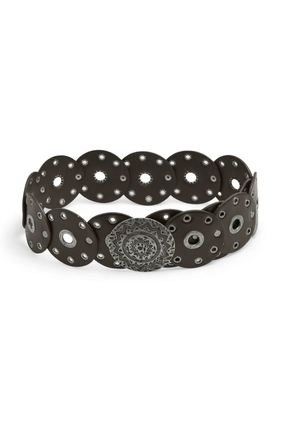 Brunt bælte fra Pieces med cirkulære elementer og nitter. Bæltet har et dekorativt metalelement i midten og er lavet af coated materiale med en læderagtig overflade.