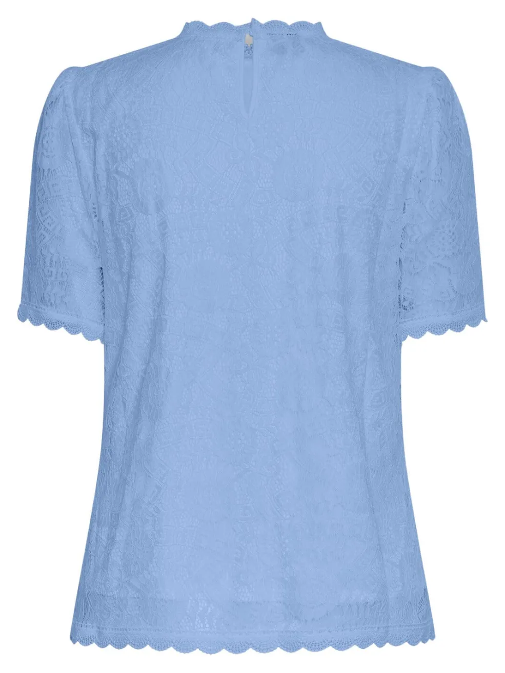 Blondetop fra Pieces i lyseblå hydrangea-nuance med blomstermønster. Toppen har en høj hals, korte ærmer og dekorative syninger langs kanten. Den bløde blonde skaber et fint udtryk.
