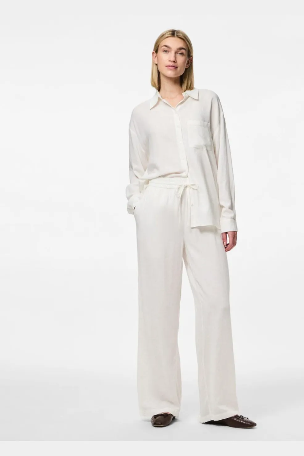 Hvide bukser fra Pieces med høj talje og gulvlang længde. Den brede pasform og det lette materiale giver bukserne et luftigt udtryk.