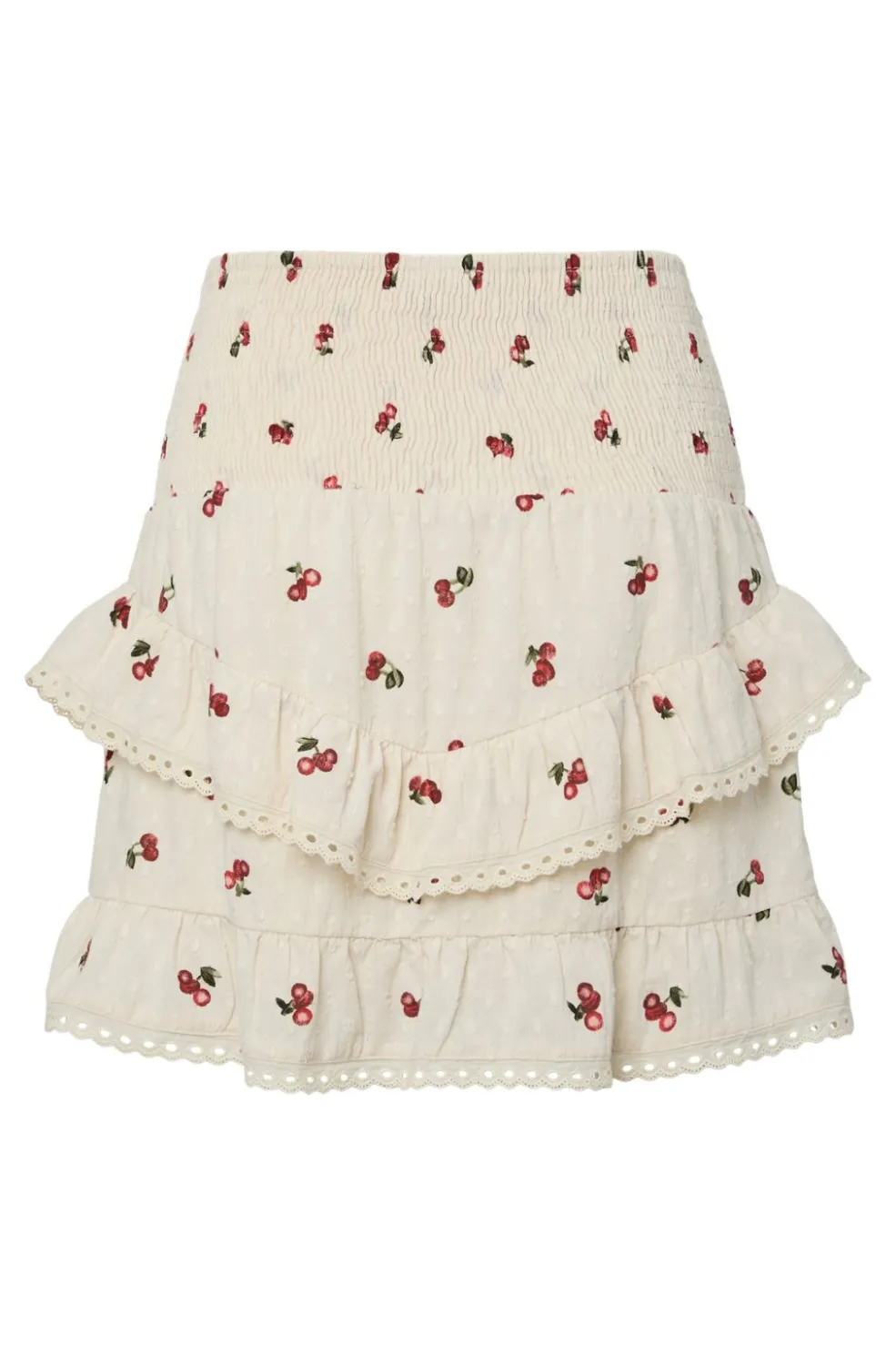 Kort smocknederdel fra Pieces i cremefarvet bomuld med et mønster af små røde kirsebær. Nederdelen har rynket talje og blondedetaljer langs flæserne i bunden.