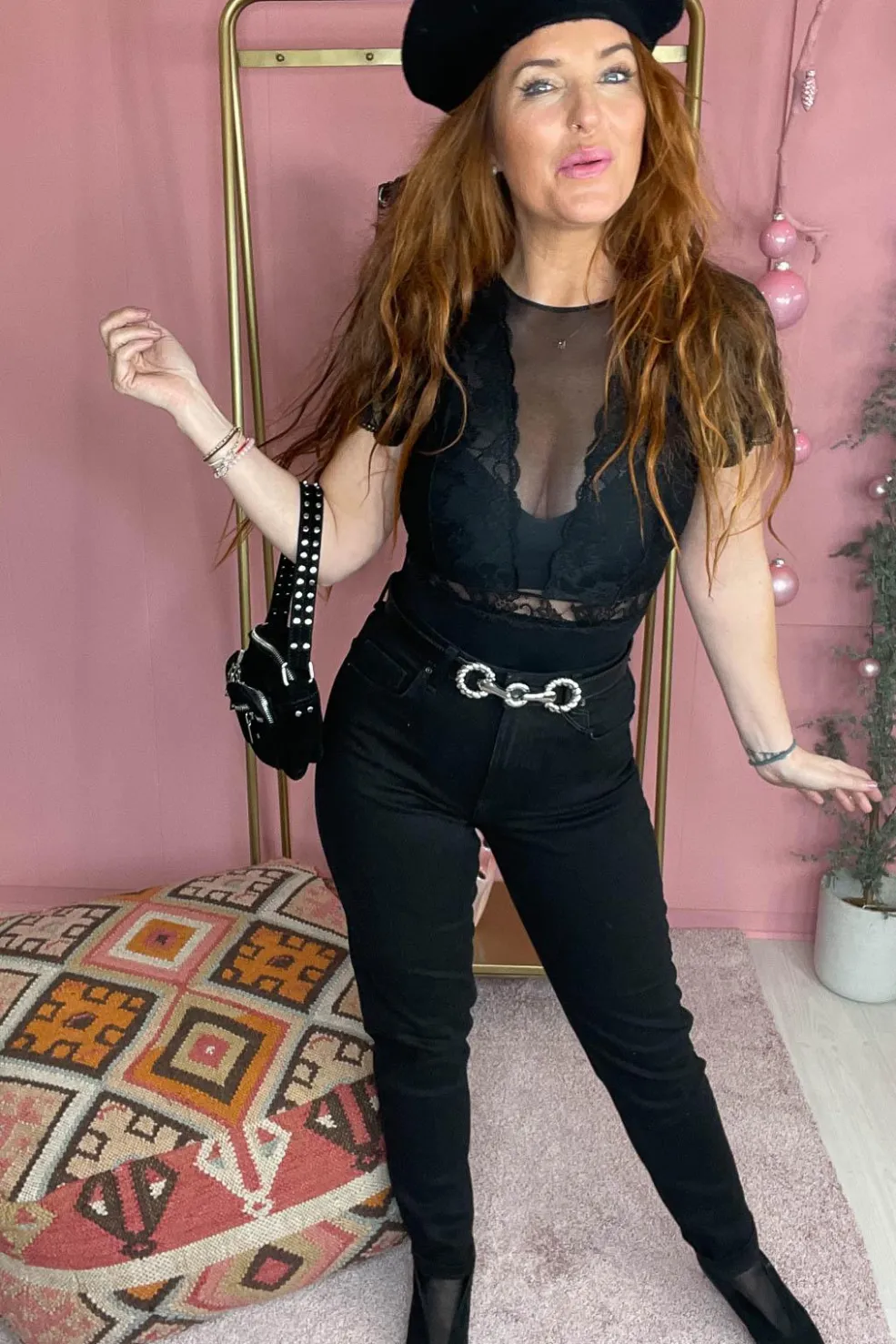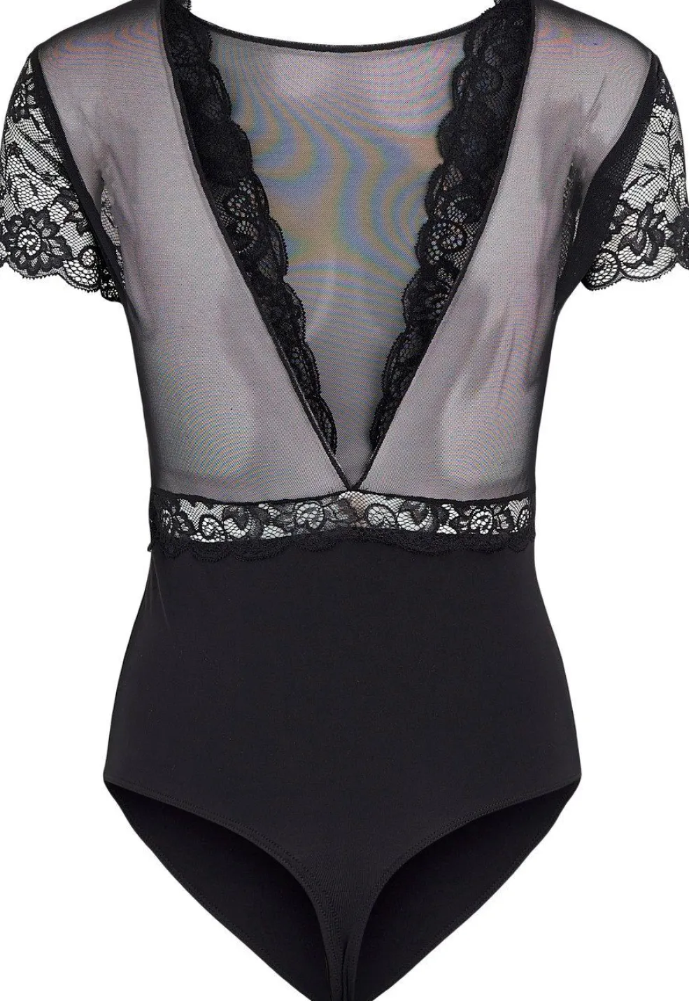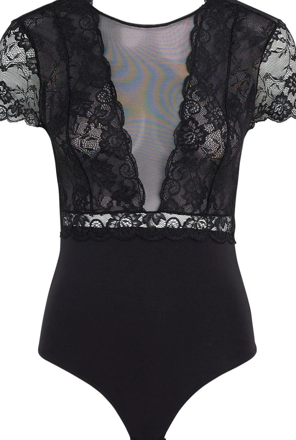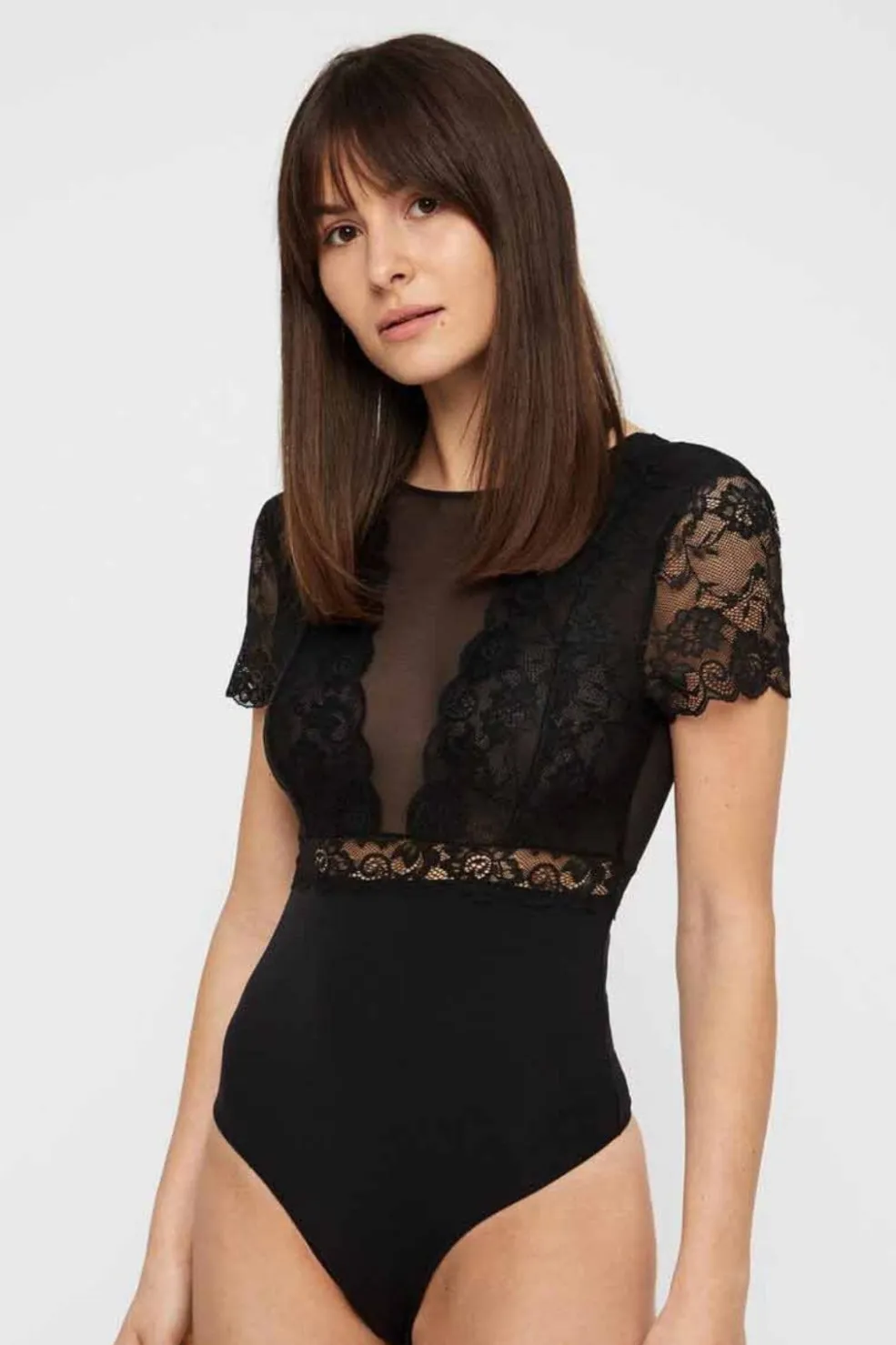 Sort bodystocking fra Pieces med gennemsigtig overdel og blondedetaljer ved skuldrene og taljen. V-udskæring og korte ærmer giver en fin kombination af design og komfort.