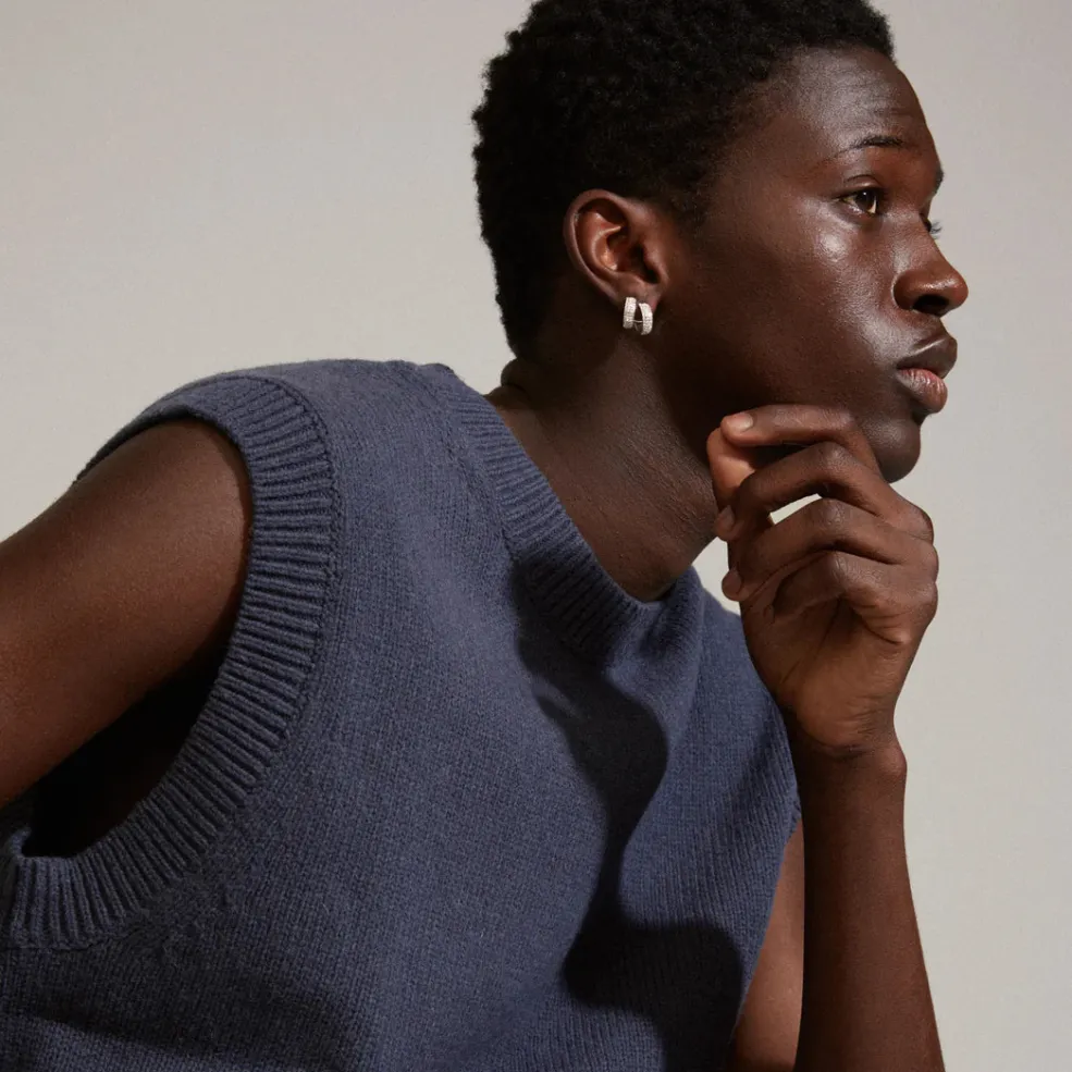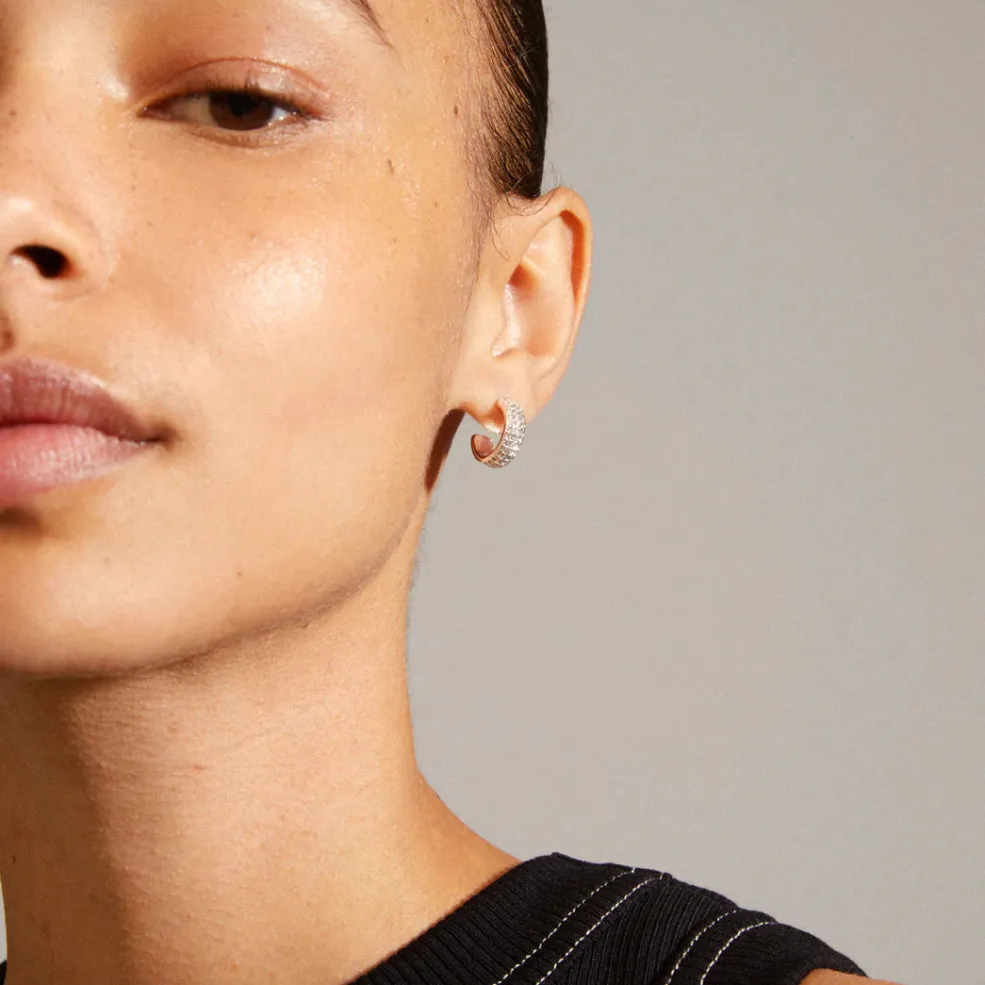 Sølvbelagte hoops-øreringe fra Pilgrim med Preciosa-krystaller. Øreringene har en blank overflade og er dekoreret med tre rækker af klare krystaller.