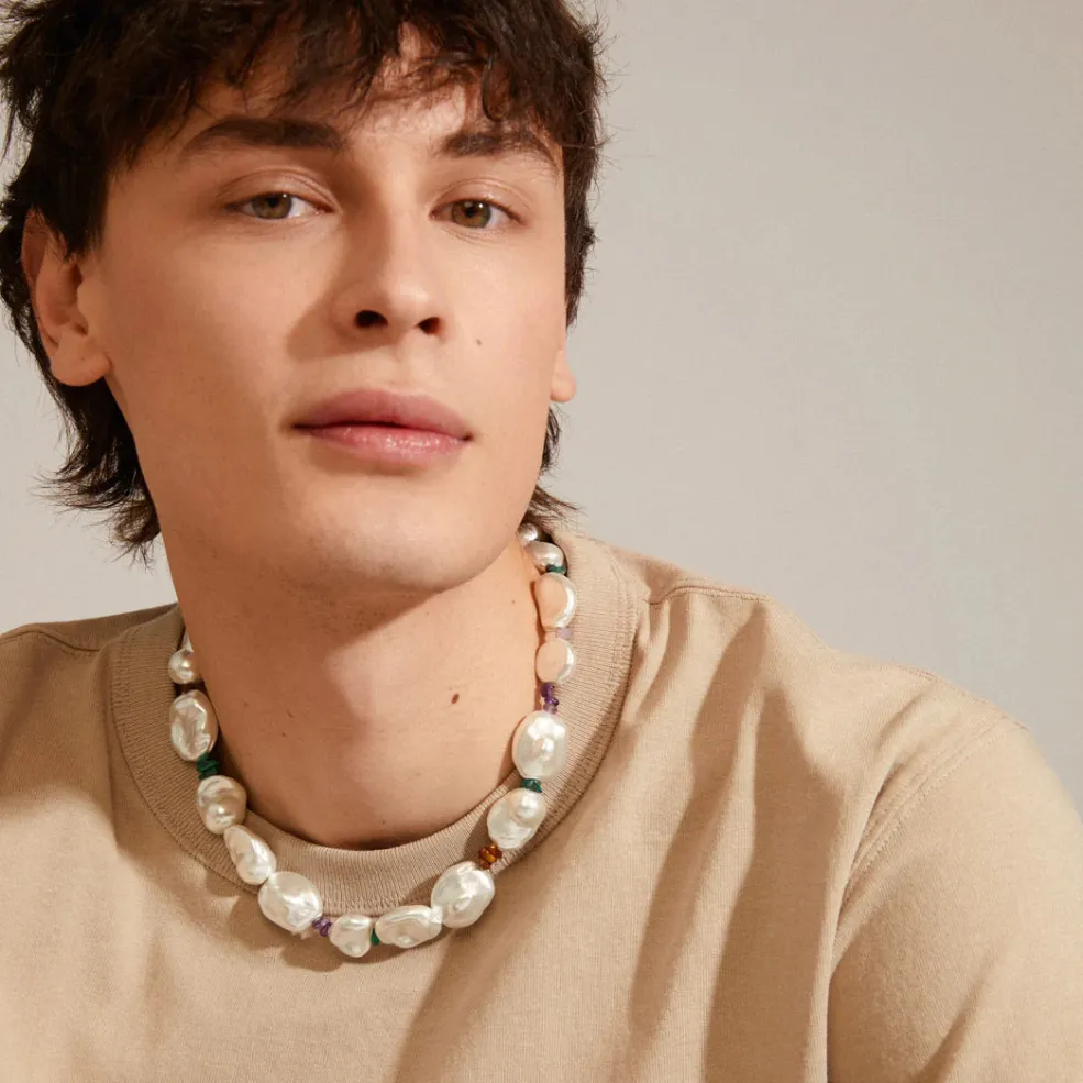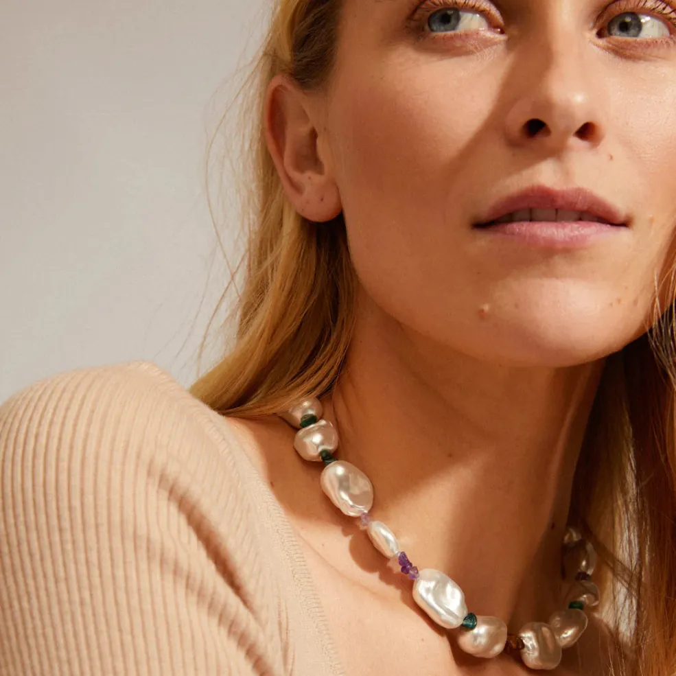 Sølvbelagt halskæde fra Pilgrim med store, uregelmæssige glasperler. Grønne, lilla og brune perler er placeret mellem de hvide perler og skaber variation i designet.