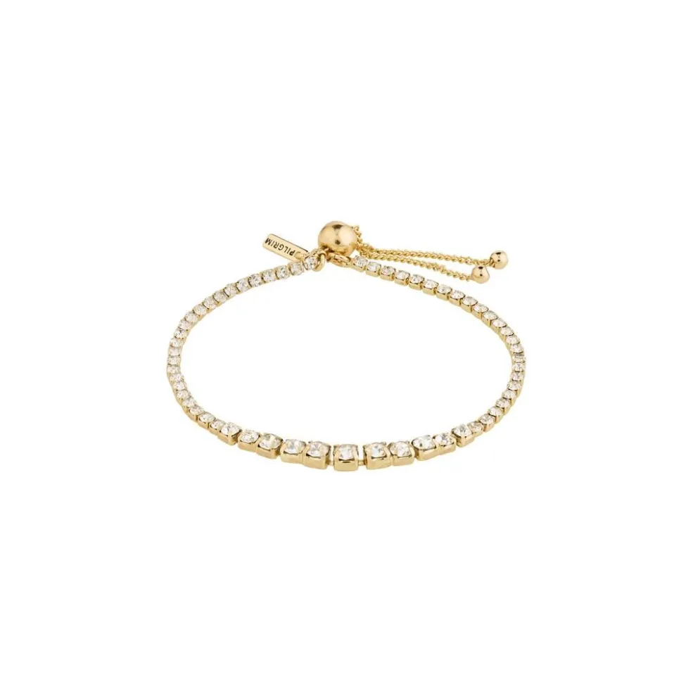 Guldbelagt armbånd fra Pilgrim med klare krystaller langs hele armbåndet. Den justerbare kæde gør det nemt at tilpasse længden til håndleddet.