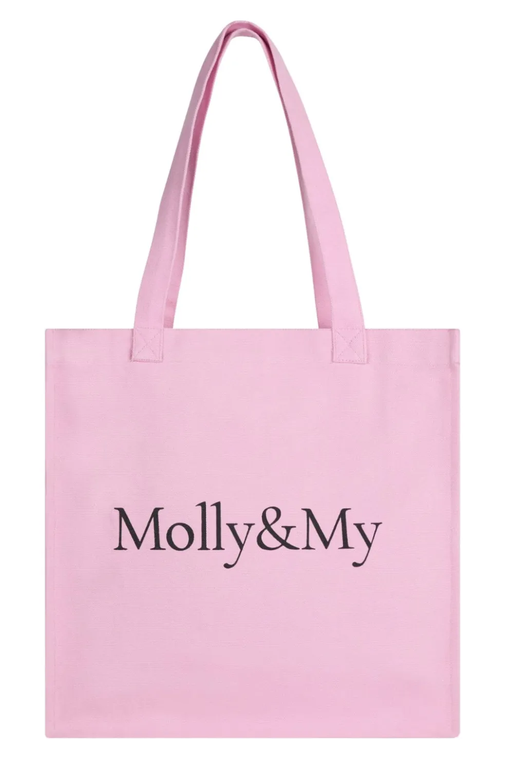 Pink tote bag fra Mellow Moon med rektangulær form. Tasken har et enkelt design med sort Molly&My-logo på forsiden og lange bærehanke.