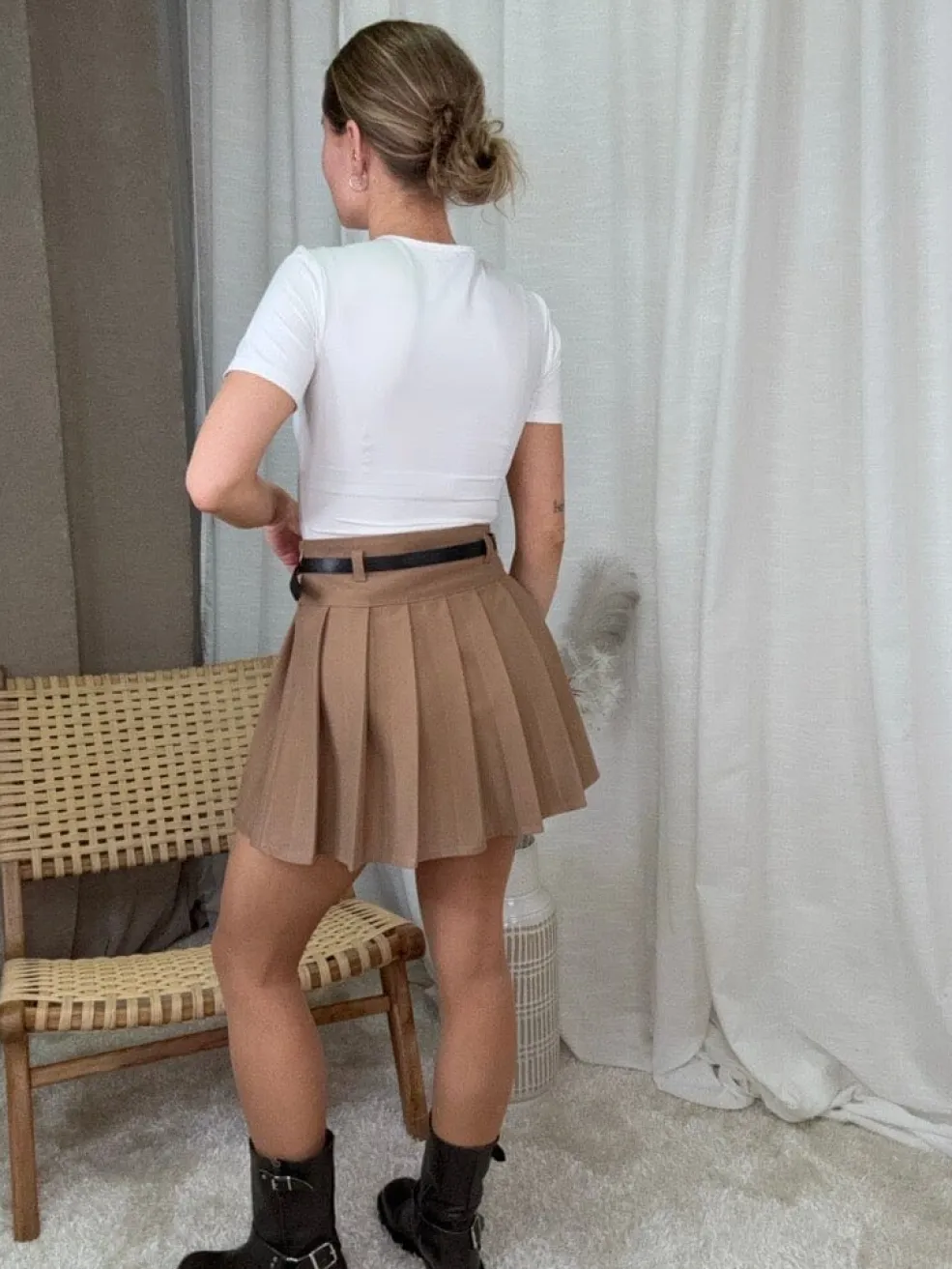 Plisseret nederdel fra A-bee i camel. Den korte nederdel har læg hele vejen rundt og en normal talje med bæltestropper. Den neutrale farve er nem at style året rundt.