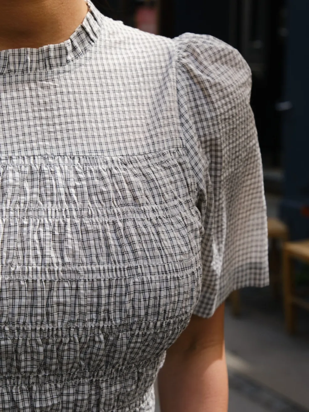 Småternet bluse fra Neo Noir i creme. Designet med høj hals og smock-detaljer på kroppen. De løse 3/4-ærmer og den tætsiddende pasform skaber en fin kontrast.