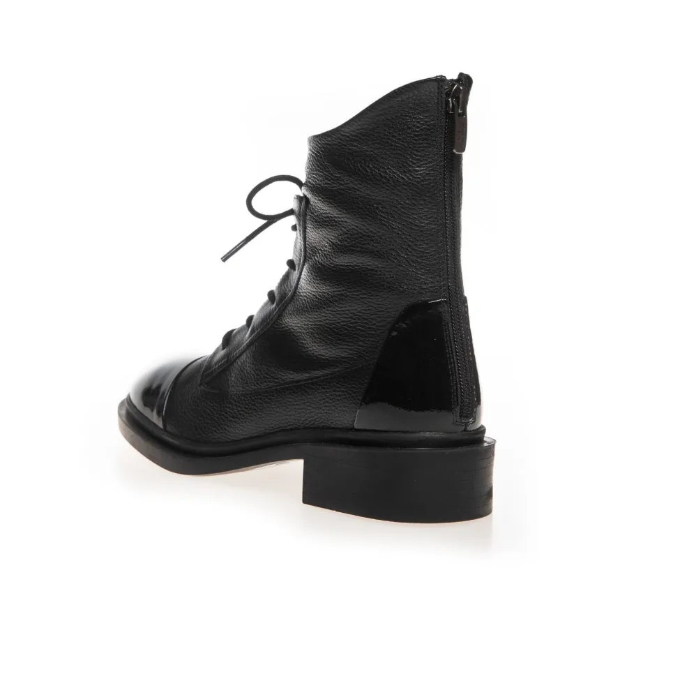 Sorte ankelstøvler fra Copenhagen Shoes med blank patenttå. Støvlerne har både snørebånd og lynlås samt en lav blokhæl.