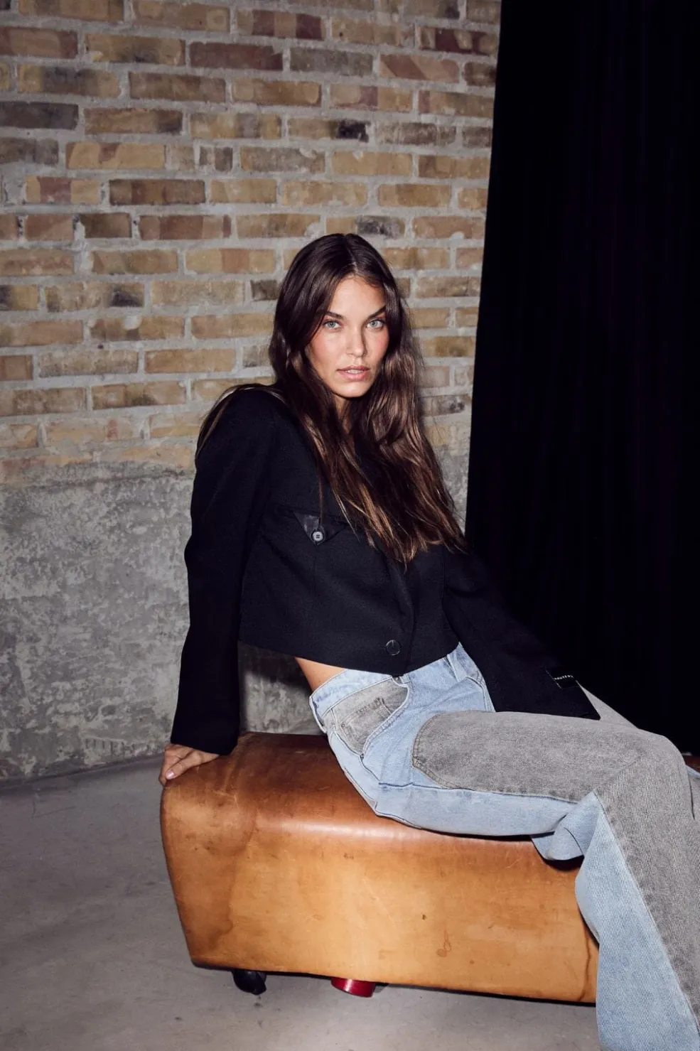 Sort cropped blazer fra Haute L’Amitié med skjortekrave og enkelt knaplukning. Blazeren har lange ærmer og to flaplommer foran.