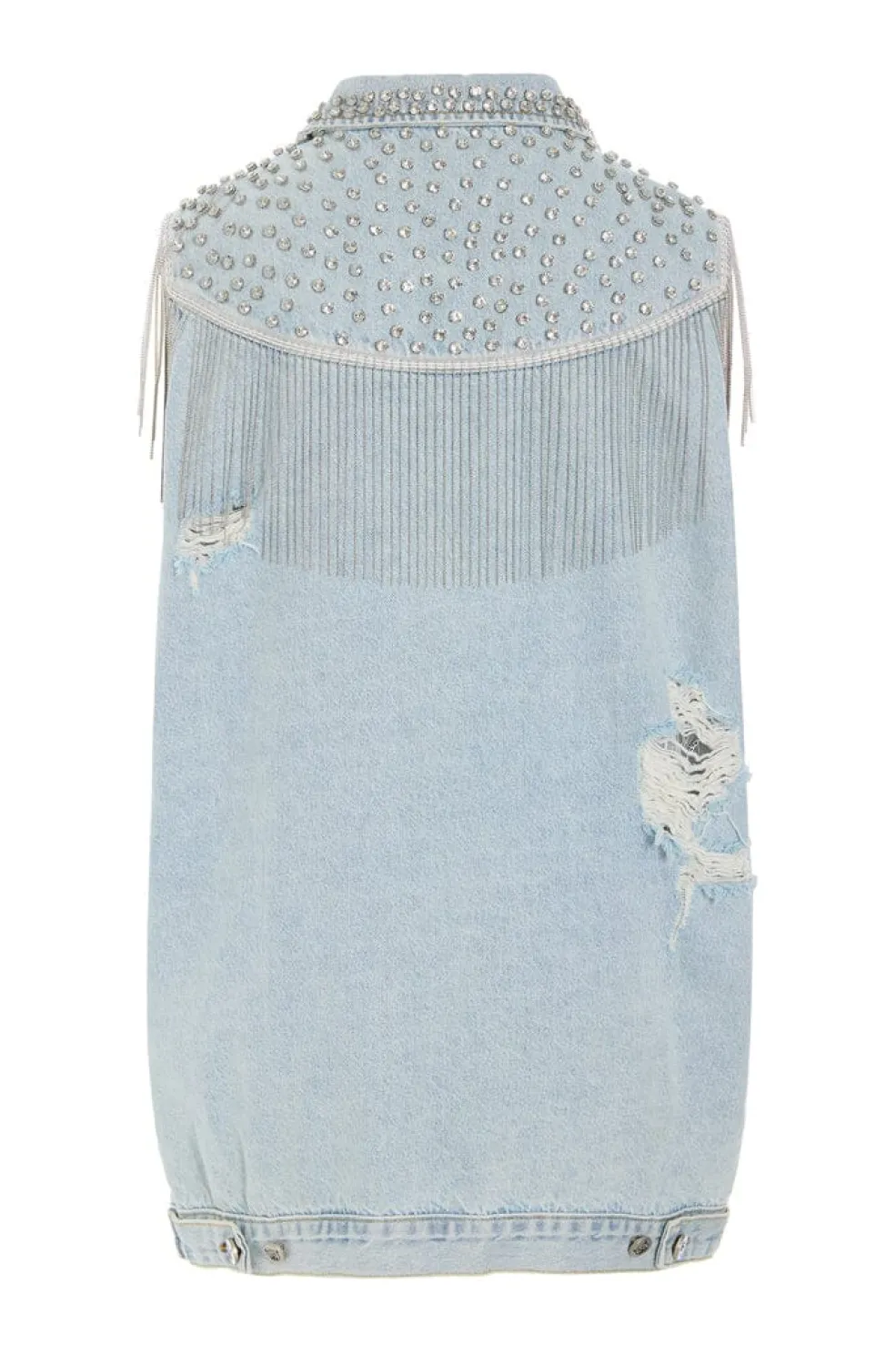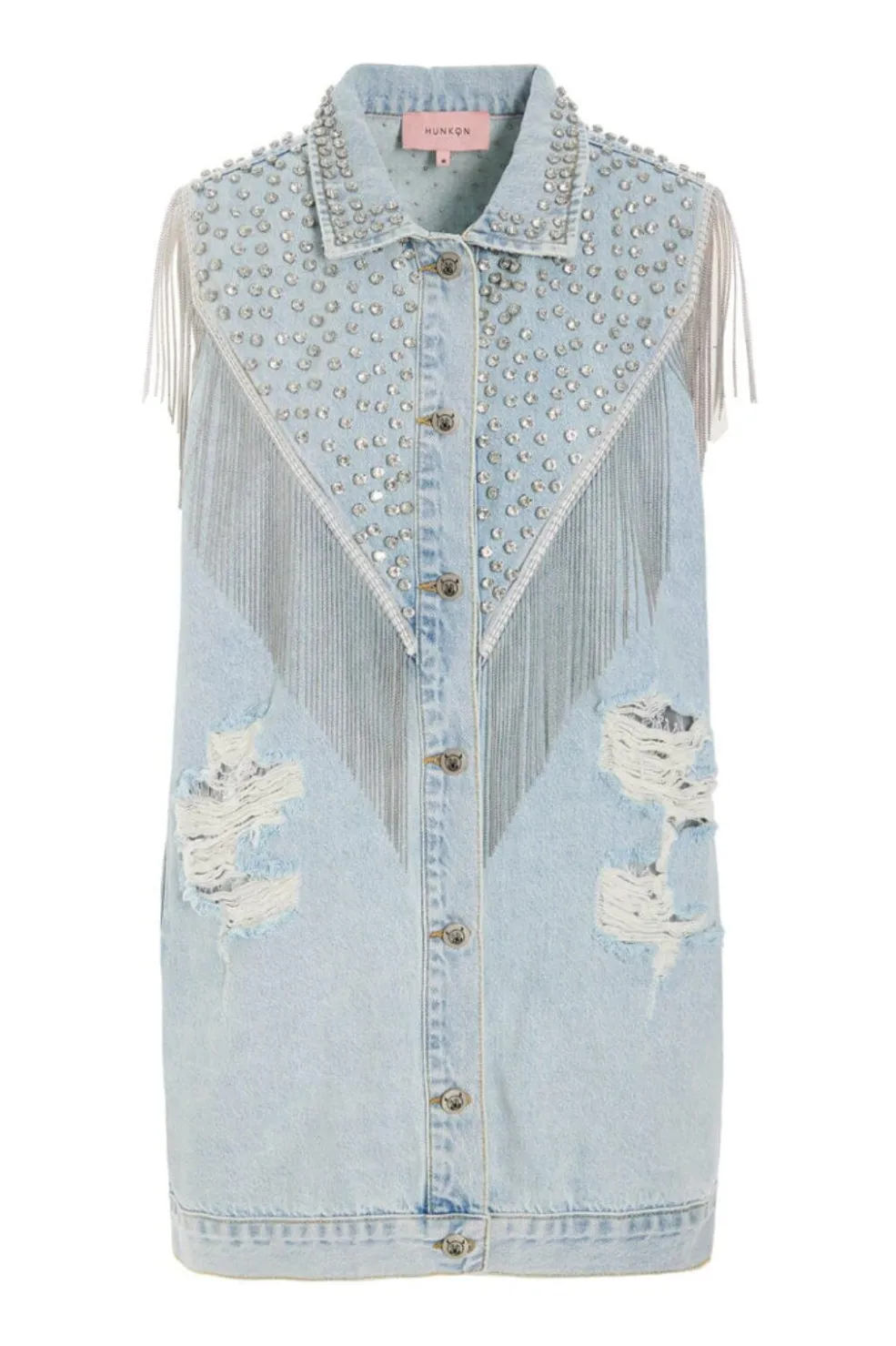 En ærmeløs denimvest fra Hunkøn i en lys blå farve. Vesten har metalnitter på skuldrene og kraven samt frynser på skuldrene og brystet.