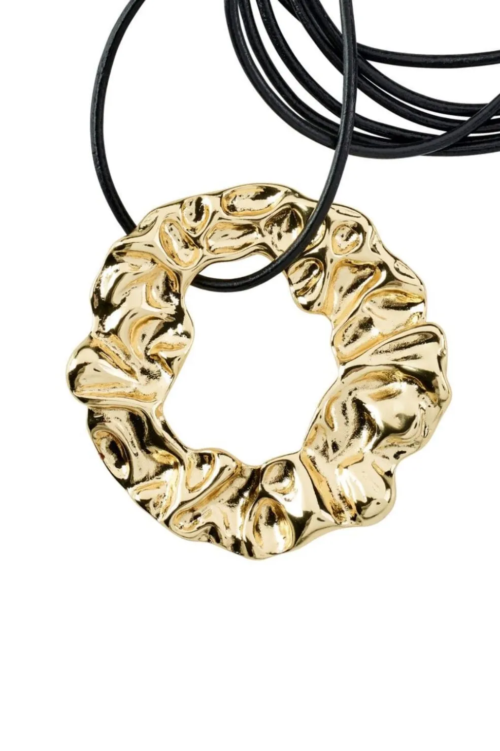 Guldbelagt halskæde fra Pilgrim med et rundt vedhæng. Den har et bølget design med en struktureret overflade på en sort lædersnor.