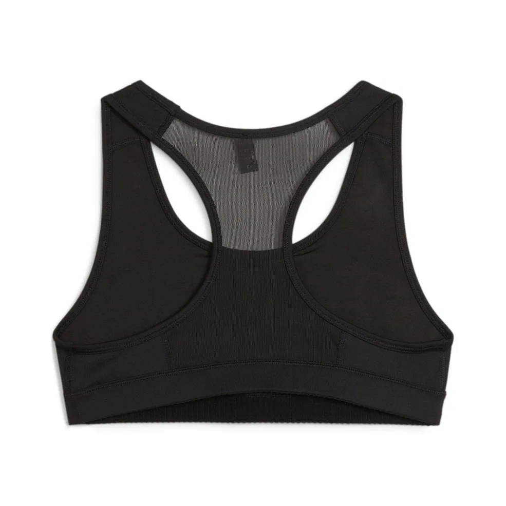 Sort sports-bh fra Puma med krydsede stropper på ryggen og bred elastik under busten. Den har medium støtte og mesh-konstruktion i ryggen til god ventilation under træning.