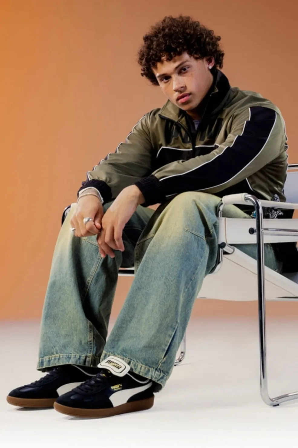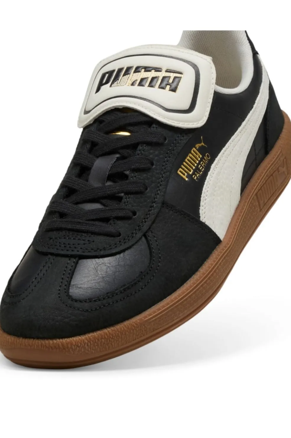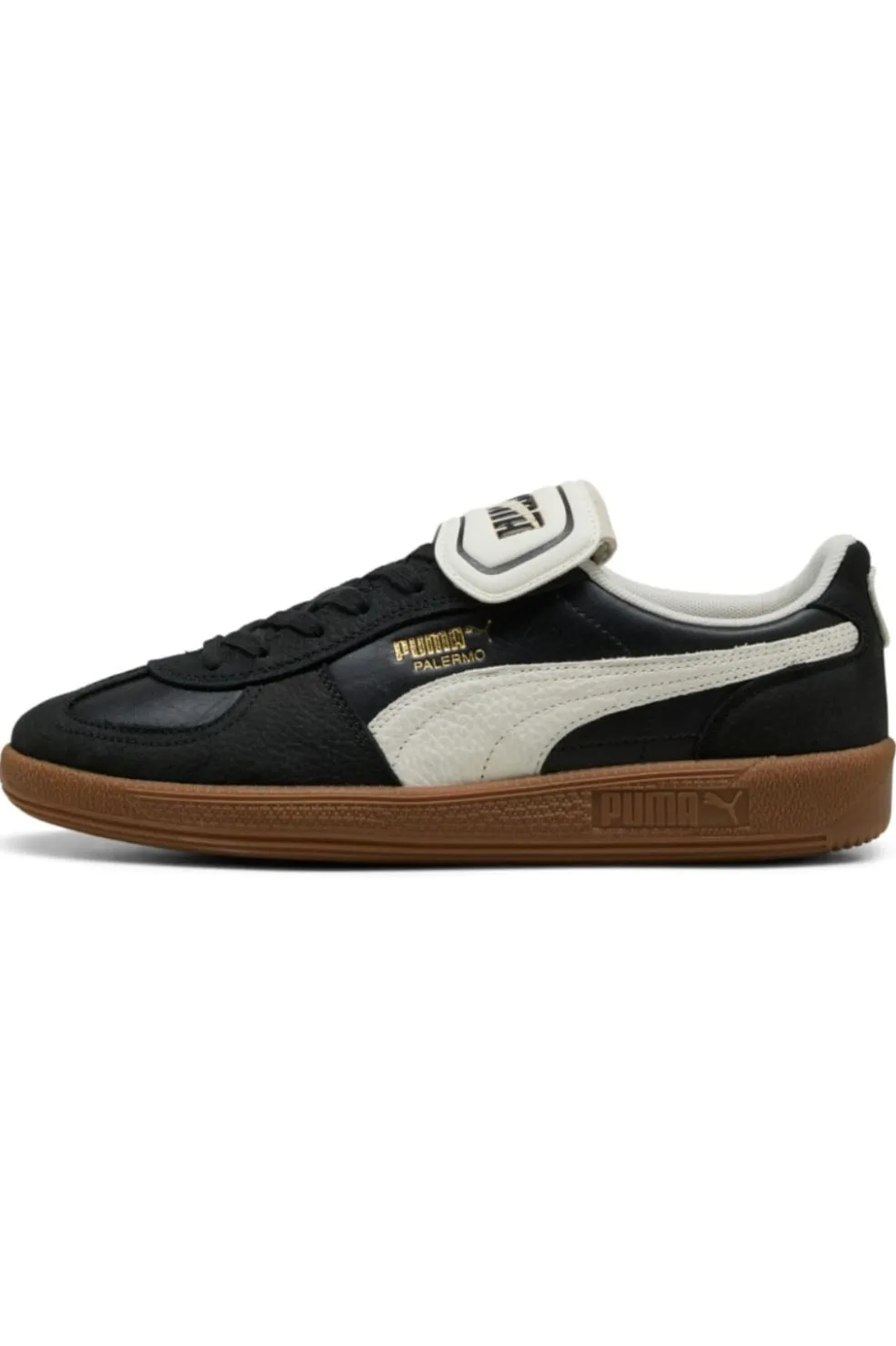 Sort sneaker fra Puma med læderoverdel og brun gummisål. Sneakeren kombinerer både snørebånd og velcrolukning med en rund tåform og klassisk design.