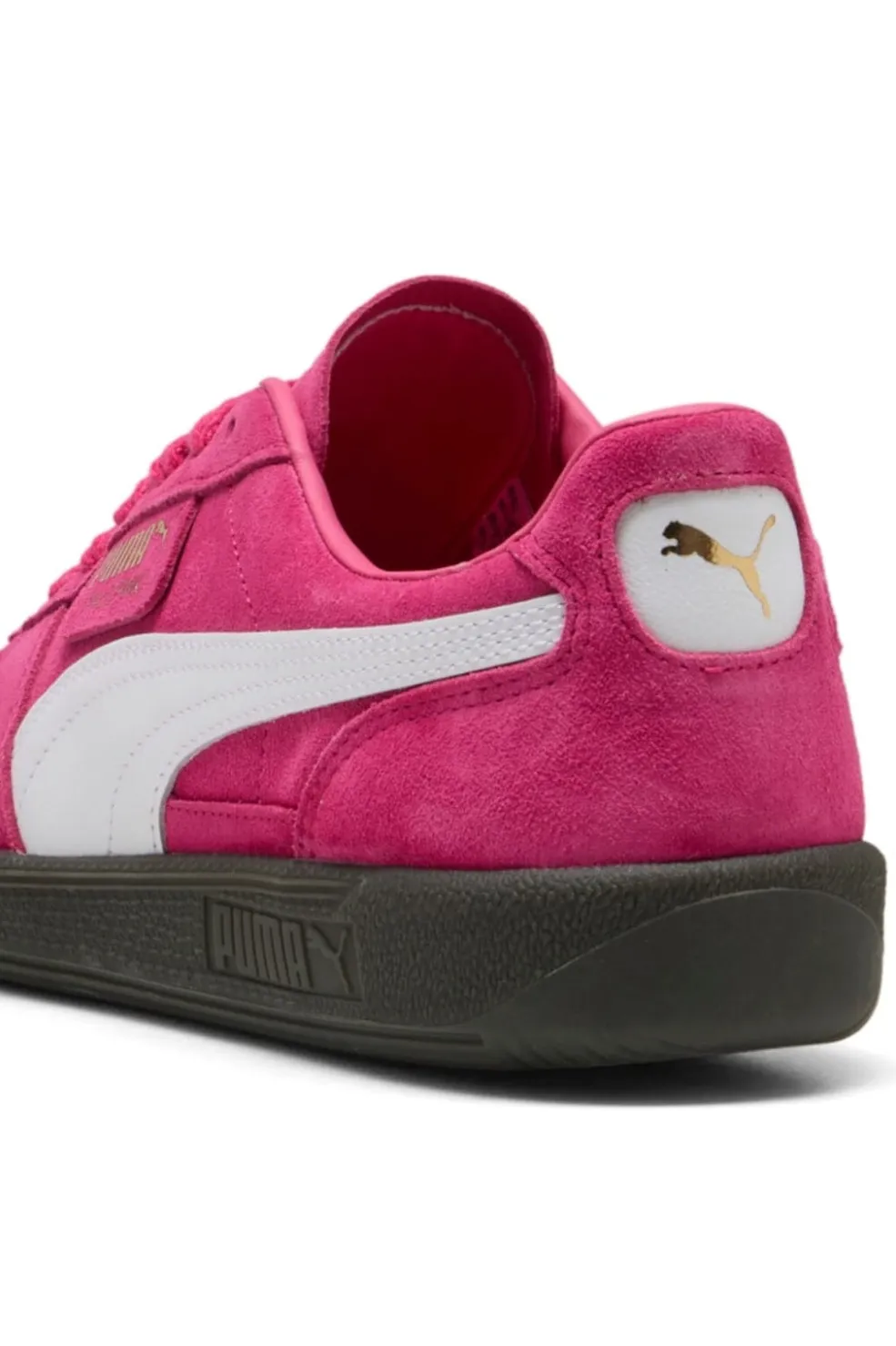 Pink sneakers fra Puma med hvide detaljer. Skoene har en overdel i læder og en sort gummisål, der giver god støtte til foden.