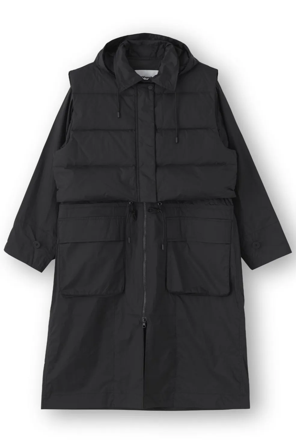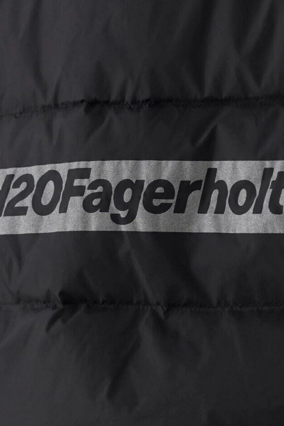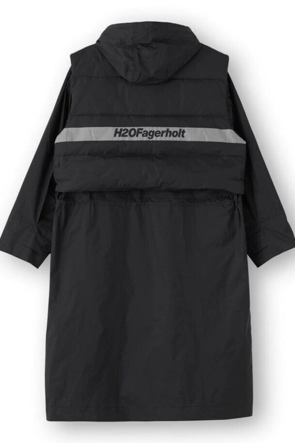 Sort regnfrakke fra H2O Fagerholt i vandafvisende nylon ripstop med tapede sømme. Den har aftagelig hætte og vest samt justerbar talje.