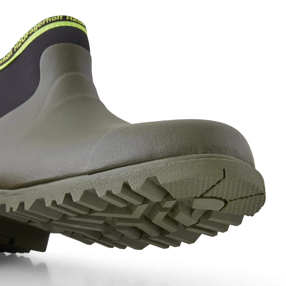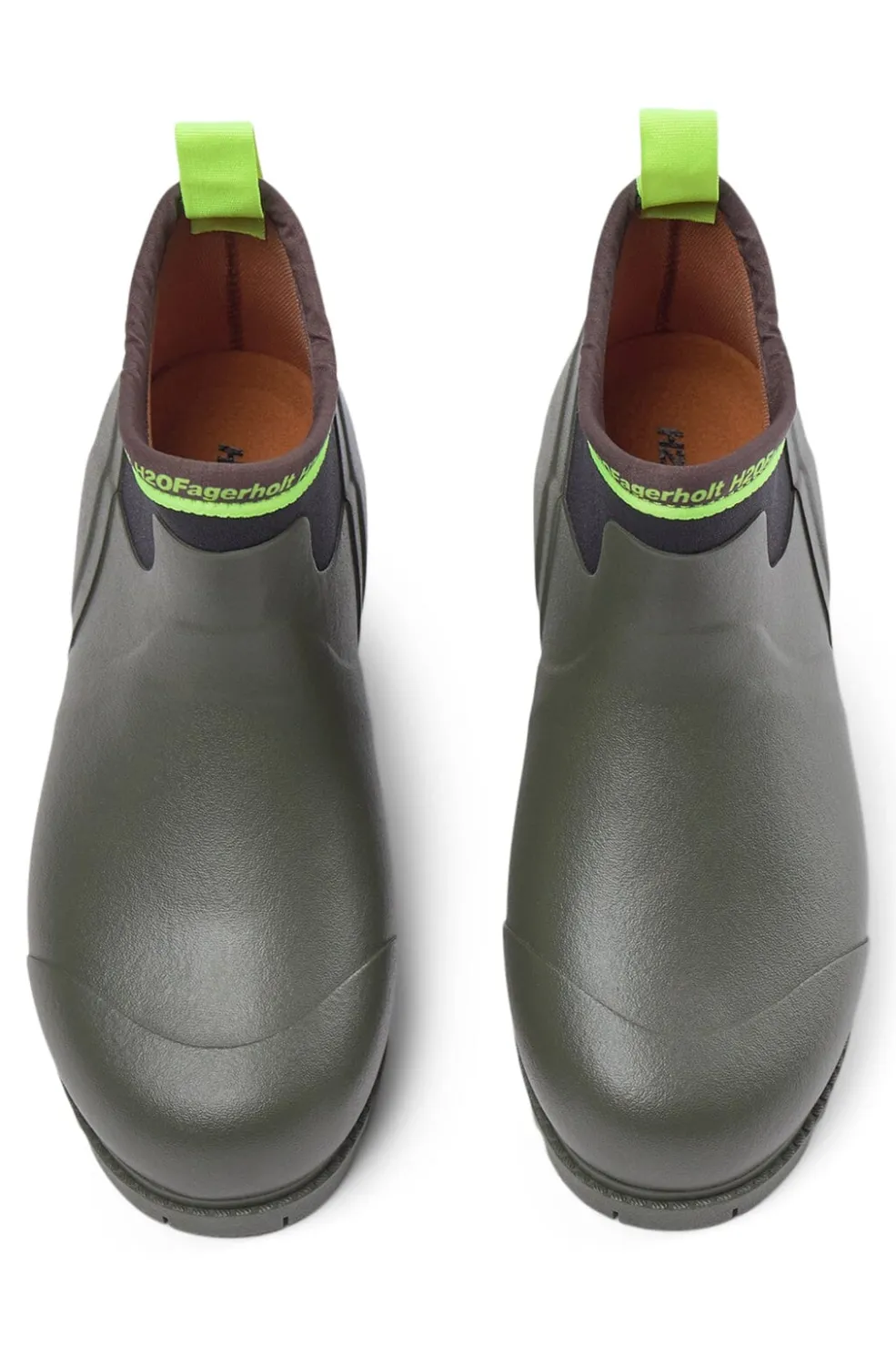 Grøn ankelstøvle i PVC-belagt polyester fra H2O Fagerholt. Støvlen har en praktisk ankelhøjde og en skridsikker sål til vådt føre.