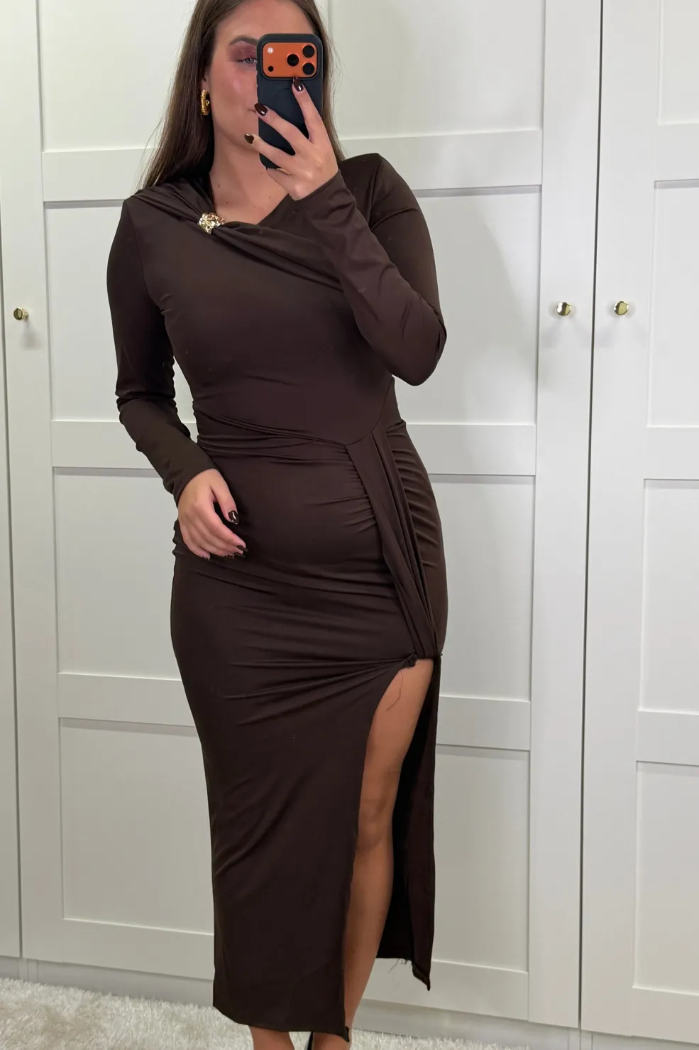 Brun kjole fra A-bee, lavet af polyester og elastan. Kjolen er egnet til fest, formelle lejligheder og bryllupper med dekorative ruffles.
