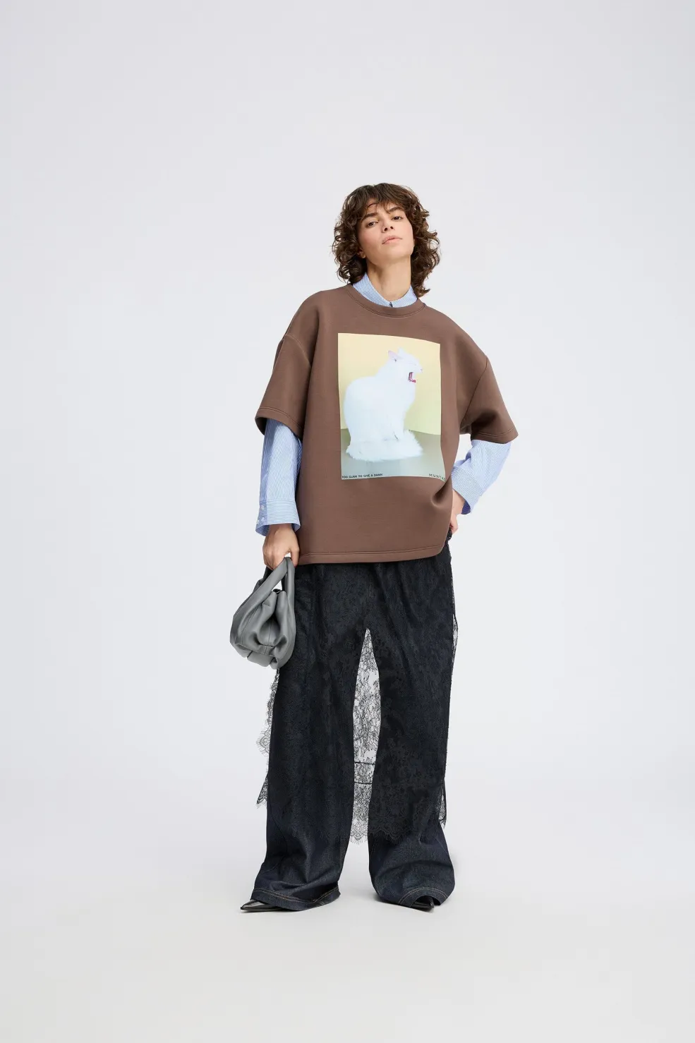 Brun bluse fra Munthe med et printdesign. Blusen har en oversize pasform og rund halsudskæring, der gør den nem at tage på og af.
