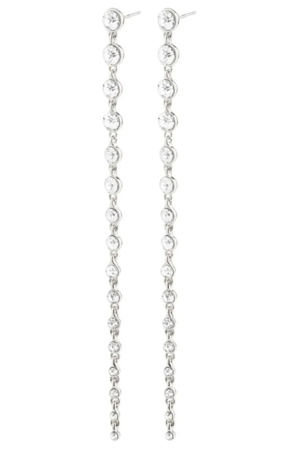 Sølvbelagte øreringe fra Pilgrim med lange kæder af krystaller. De består af flere runde krystaller, der er sat sammen i en lodret linje fra toppen til bunden.