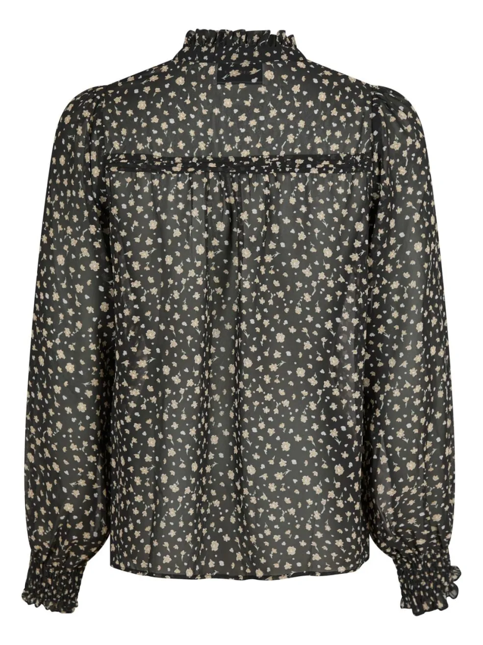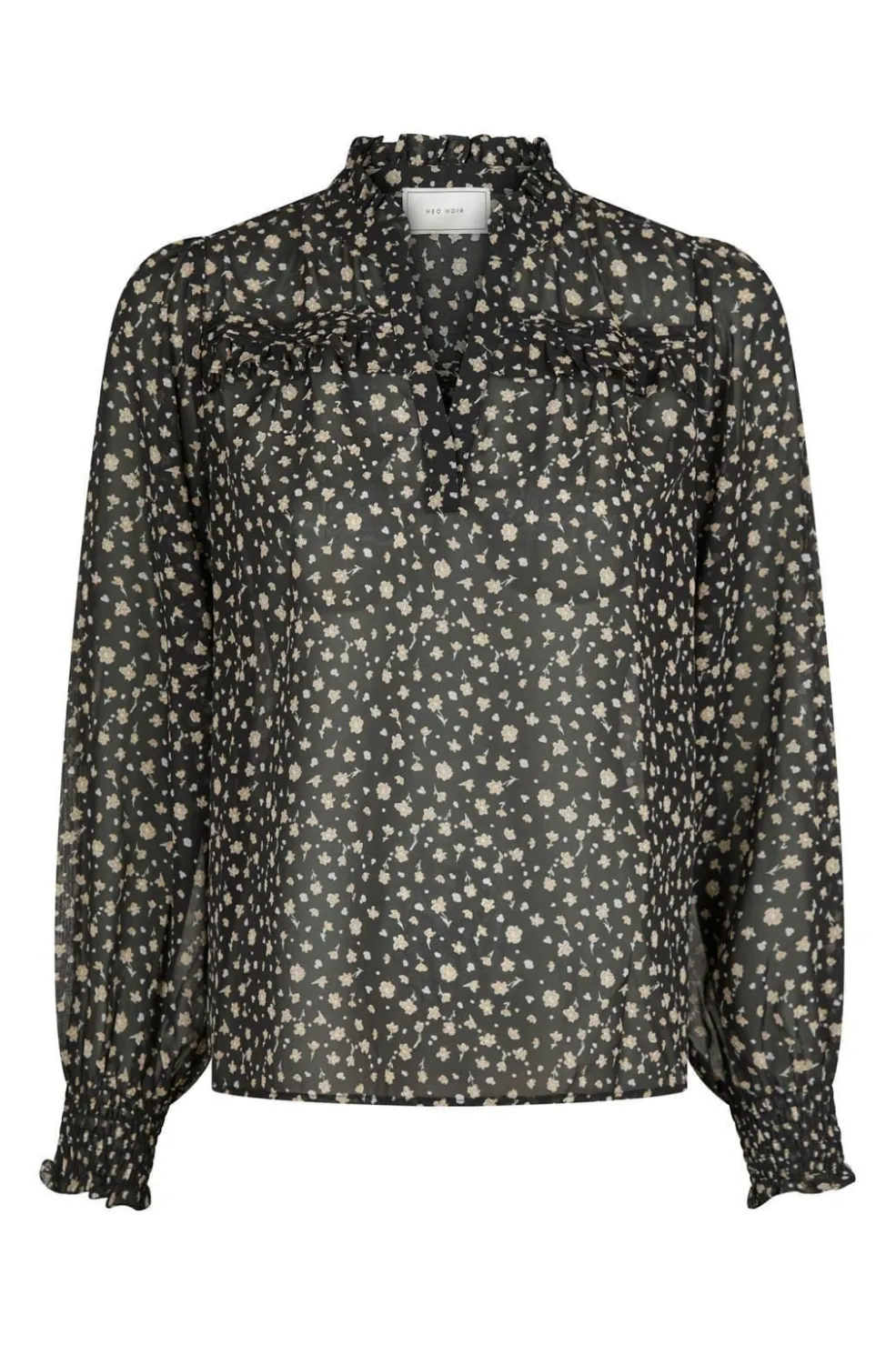 Sort bluse fra Neo Noir med små lyse blomster. Blusen har en høj hals med flæser og lange ærmer med indsamlede manchetter.