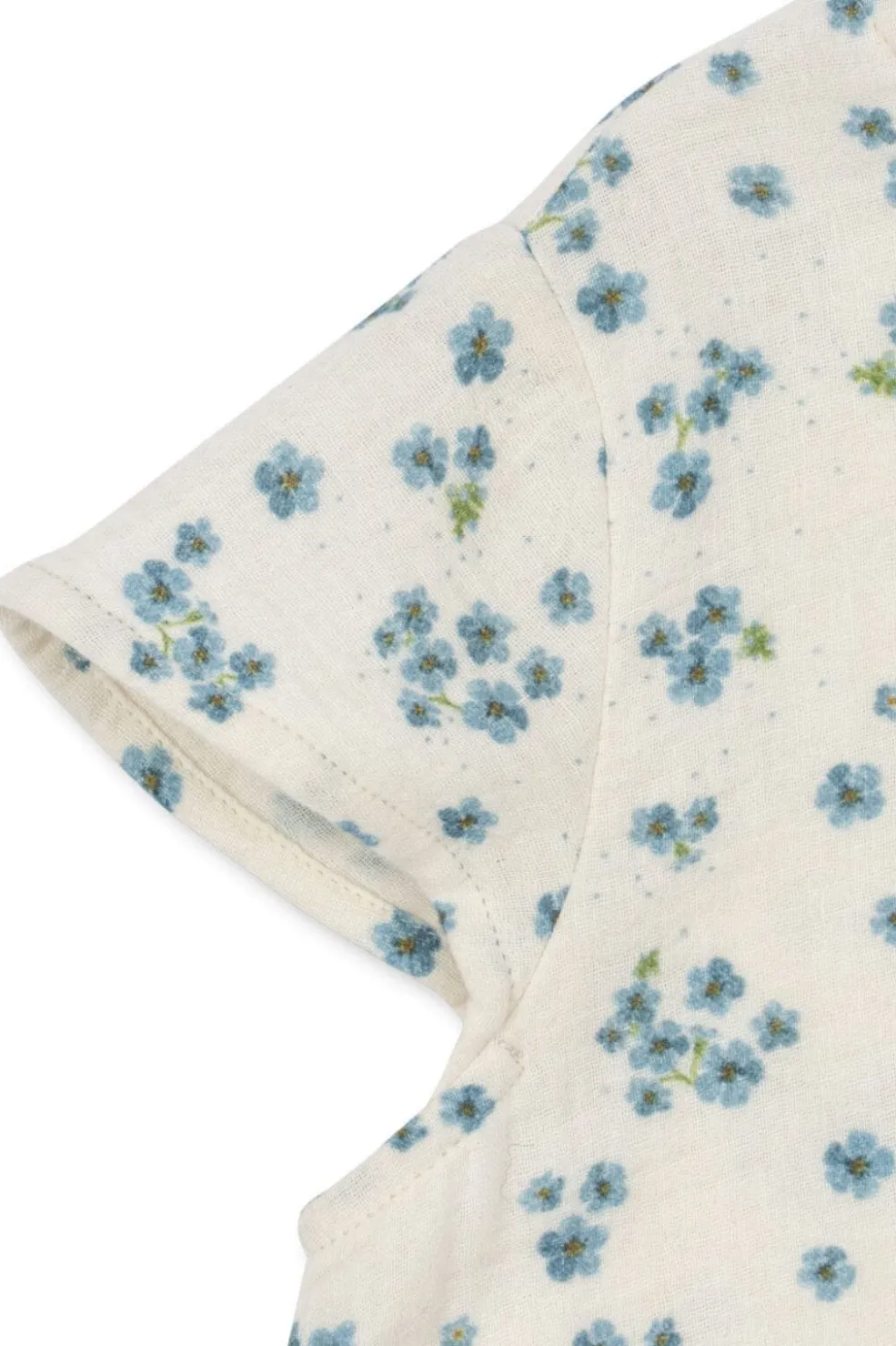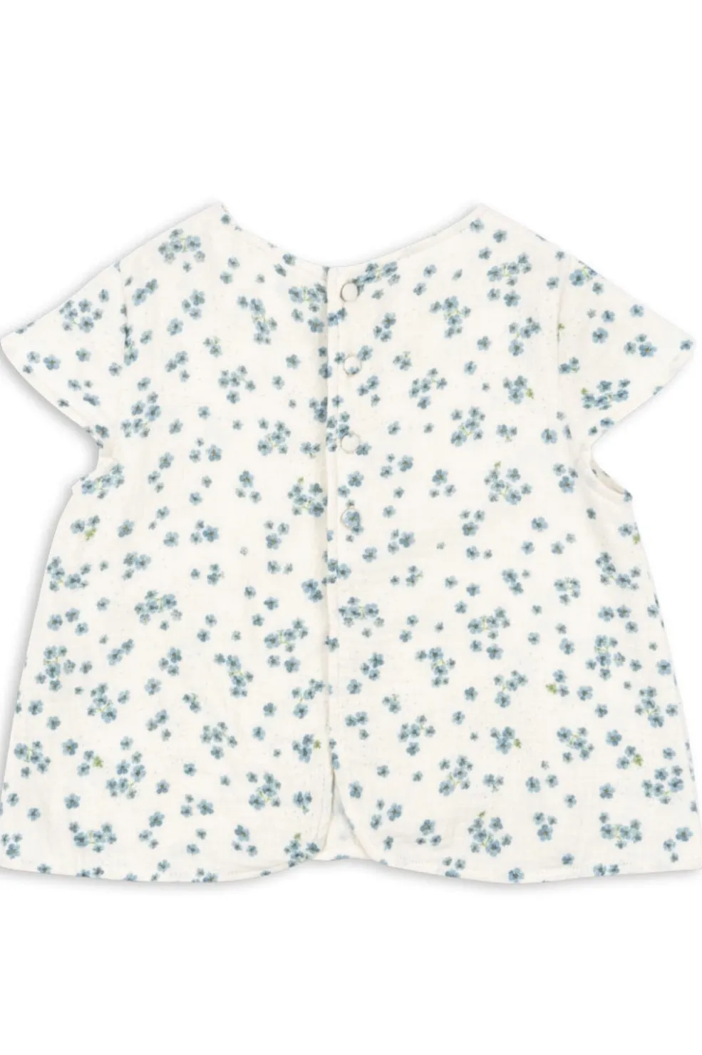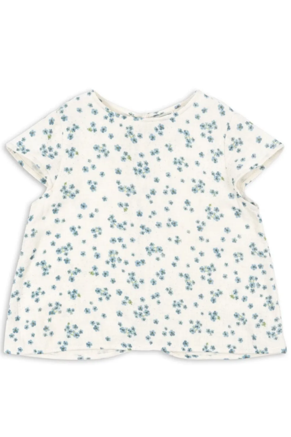 Top fra Konges Sløjd med blå forglemmigej-blomster på hvid baggrund. Den korte model har rund hals og knapper som lukning.