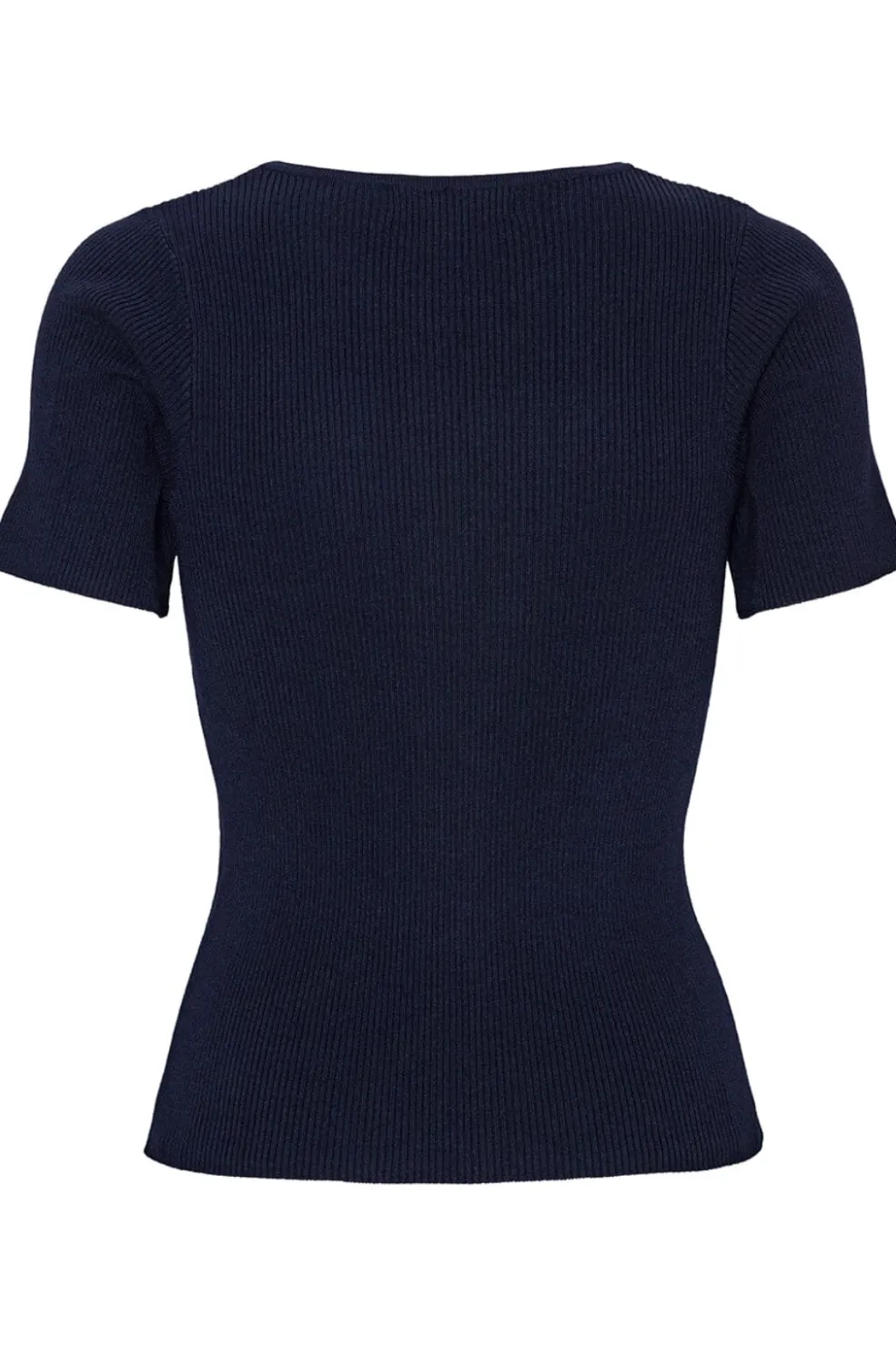 Kortærmet ribstrikket top fra A-View i mørkeblå. Toppen har en tætsiddende pasform og rund halsudskæring. Den ribbede struktur giver stretch og god komfort.
