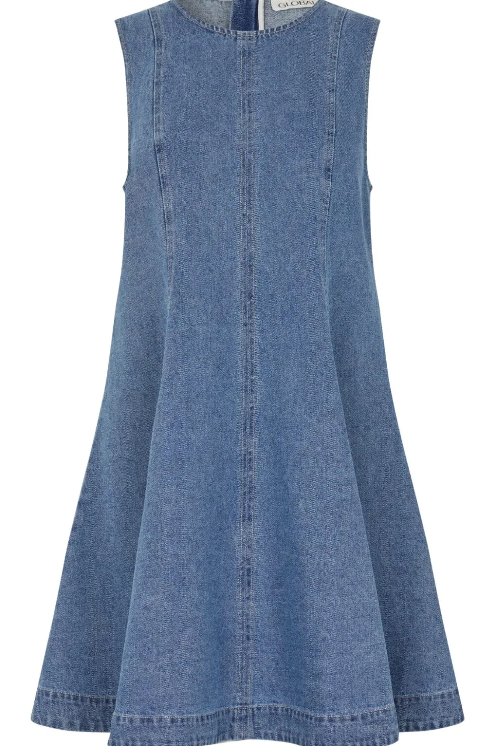 Denimkjole fra Global Funk i lys blå. Kjolen har en rund halsudskæring og peplum-design ved taljen. Den er uden ærmer og har en lynlås i ryggen.