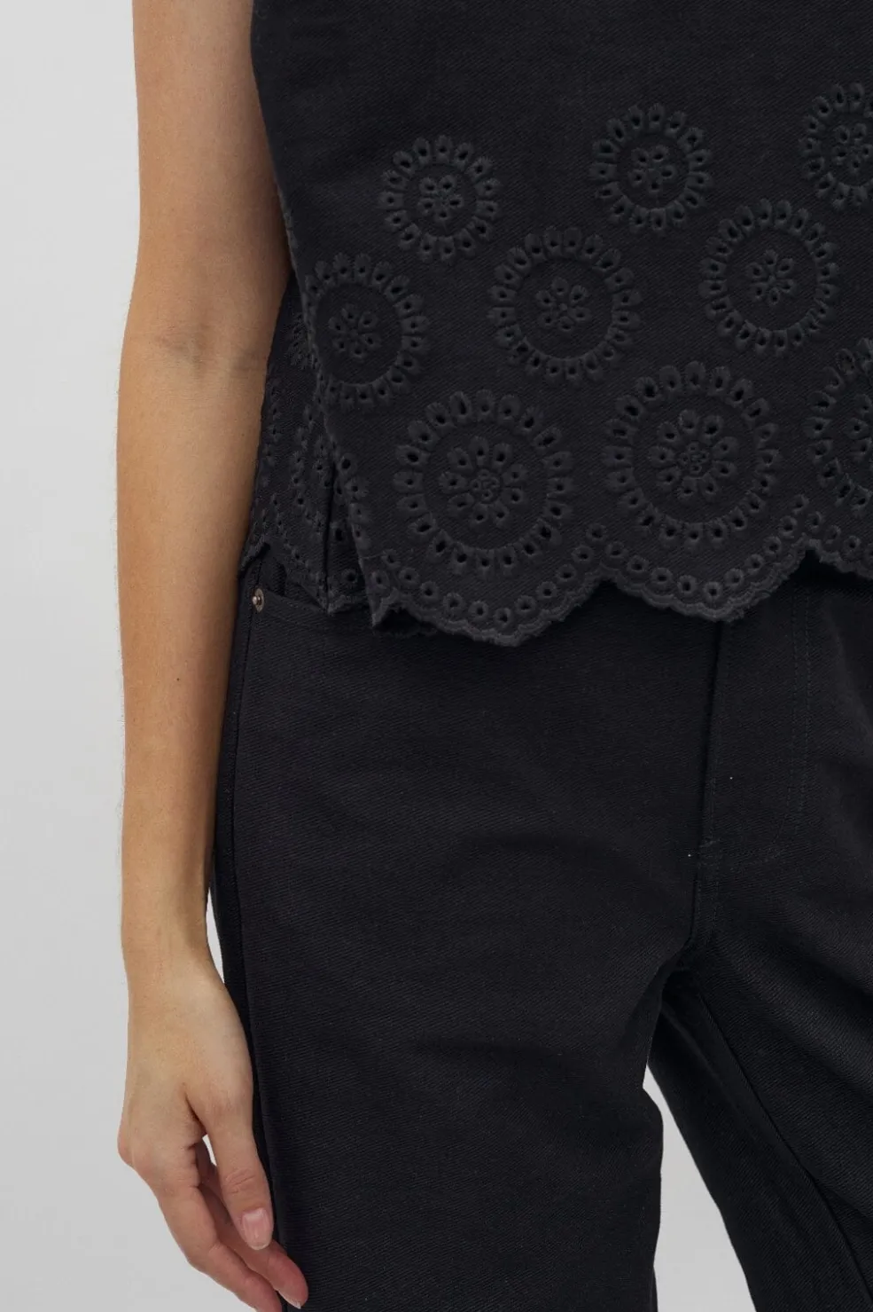 Sort top fra Global Funk med broderi og scallop-kant. Toppen har en rund halsudskæring og et ærmeløst design med dekorative udskæringer langs bunden.