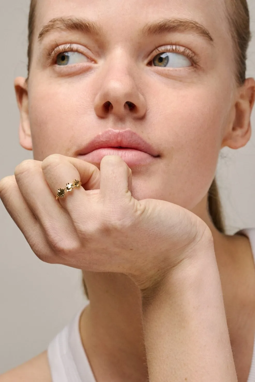 Guldbelagt ring fra Enamel Copenhagen med tre solsikker i genanvendt sterling sølv. Ringen har en blank overflade med detaljer i solsikkemønsteret.