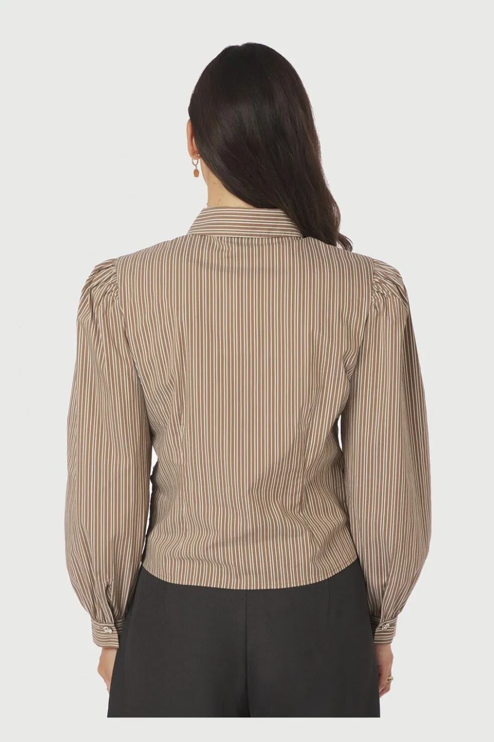 Stribet skjorte fra Neo Noir i lys brun. Skjorten har puffede ærmer med samlinger ved skuldrene og manchetterne samt en klassisk skjortekrave med dekorativ knap.