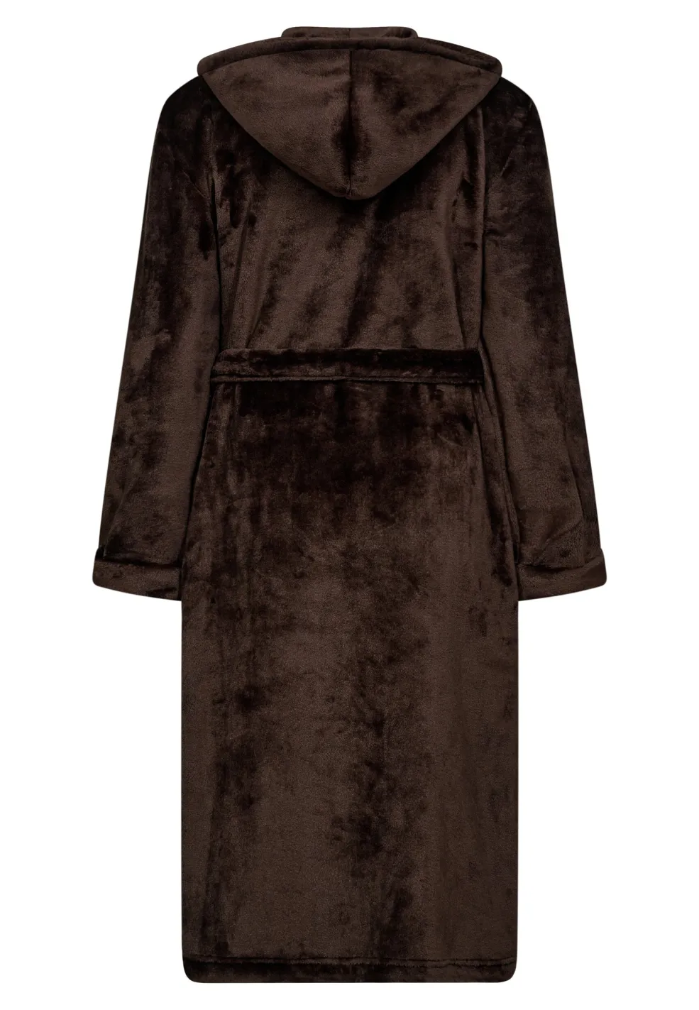 Brun badekåbe fra Decoy med hætte, bindebælte omkring taljen og to forlommer. Badekåben er lavet af 100 % polyester i en ensfarvet brun nuance.
