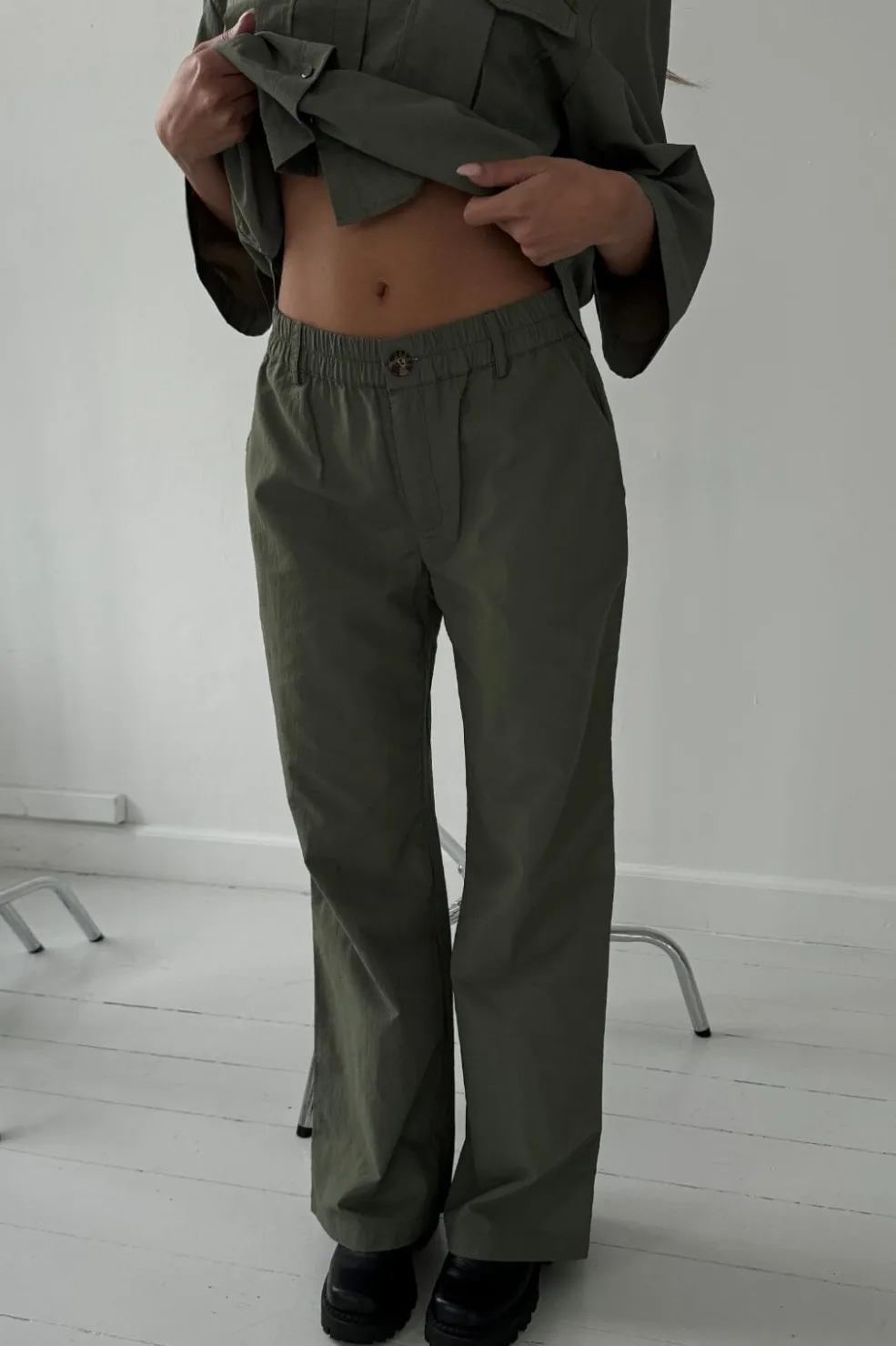 Army-farvede bukser fra Continue i gulvlængde. Bukserne har en afslappet stil med elastik og knapper i taljen.