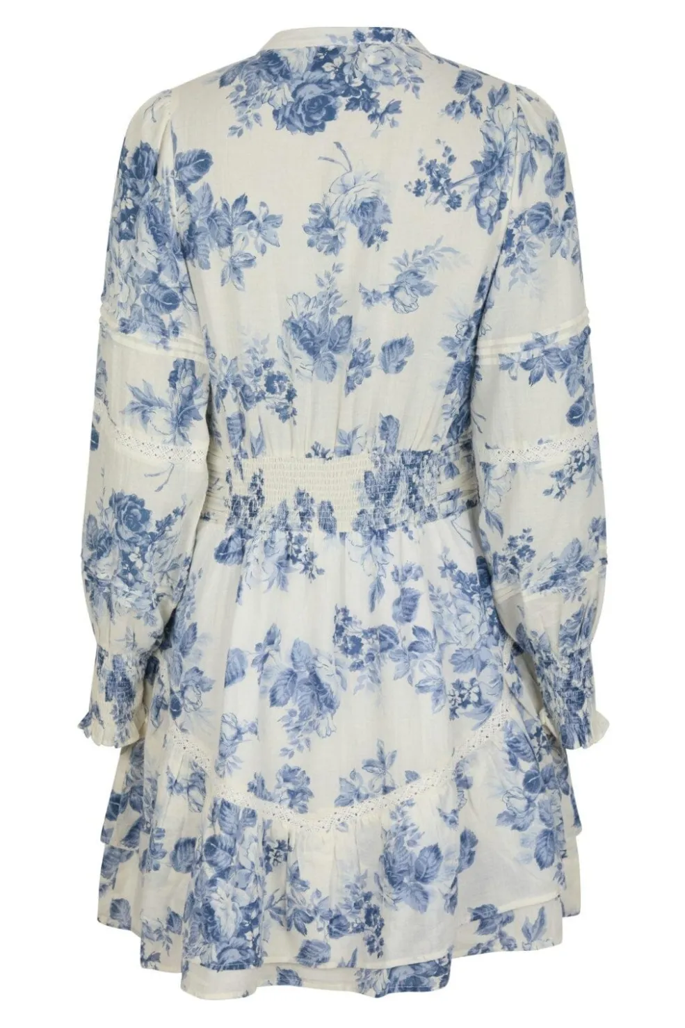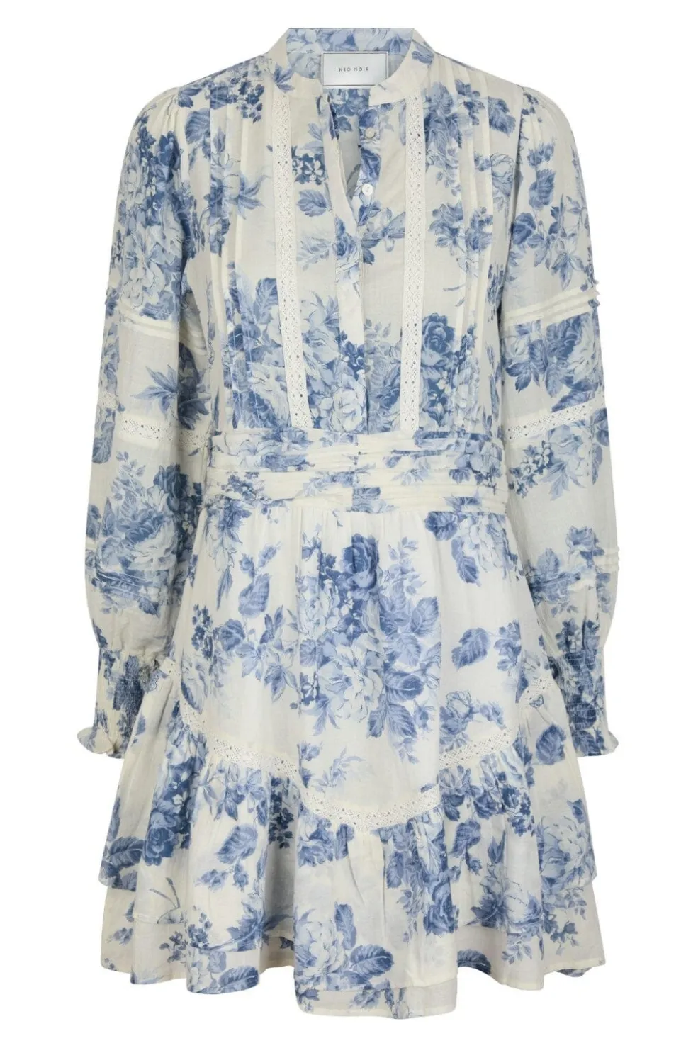 Kort kjole fra Neo Noir i lyseblå med hvidt blomsterprint. Kjolen har knapper foran, taljebånd og et rynket skørt med blondedetaljer.