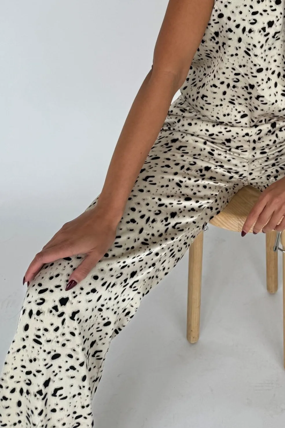 Bukser fra Continue med geopardprint i beige og sorte nuancer. De brede ben skaber en karakteristisk silhuet. Designet har en afslappet pasform.