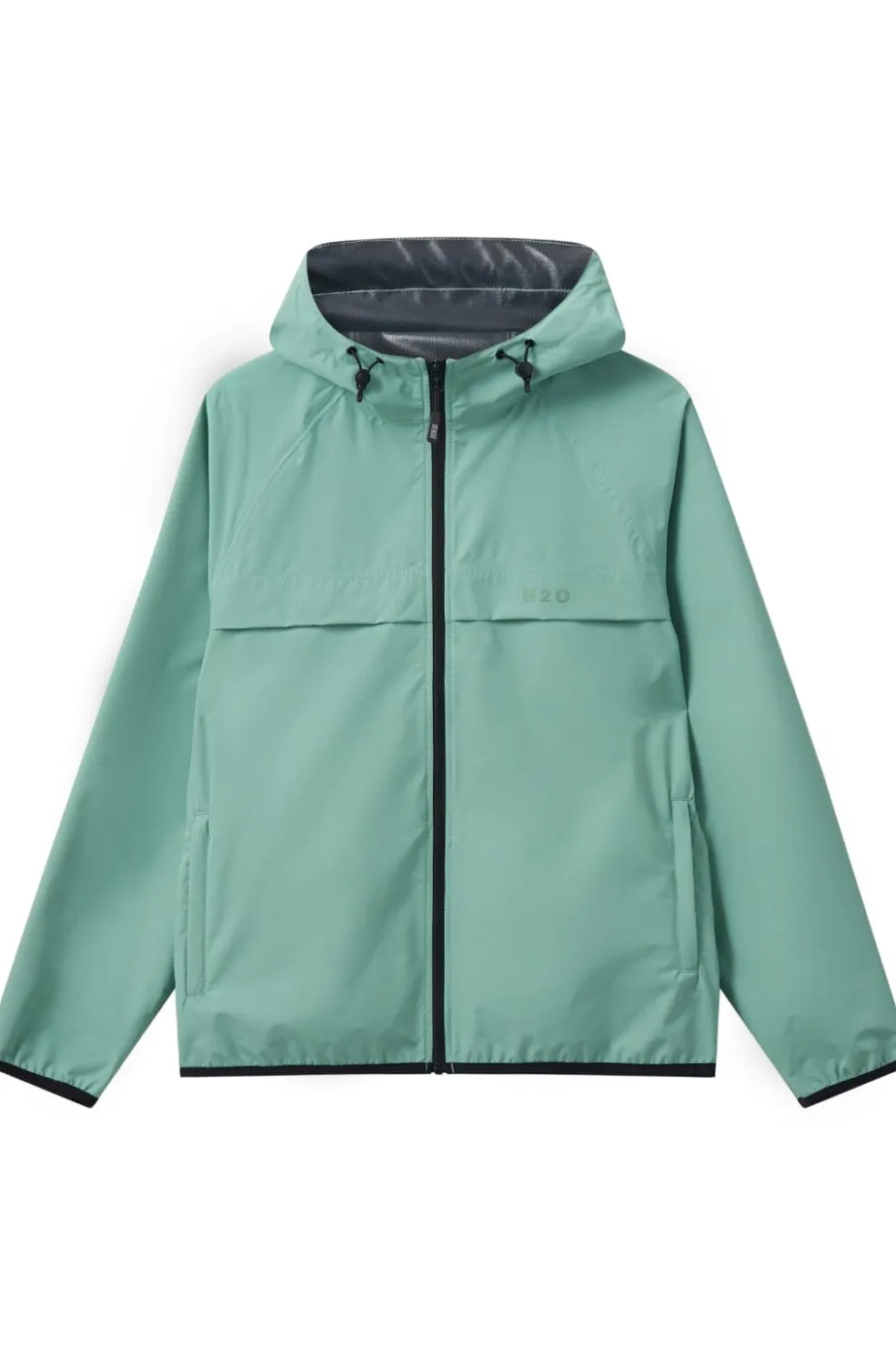 Regnjakke fra H2O i lysegrøn med vandtæt og åndbar konstruktion. Den er fremstillet af genanvendt polyester med tapede sømme og har en praktisk pakbar funktion.