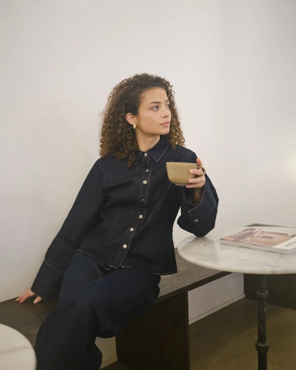 Mørkeblå denimskjorte fra Neo Noir i tyndt og blødt denim. Skjorten har en skjortekrave og brede manchetter på de lange ærmer.