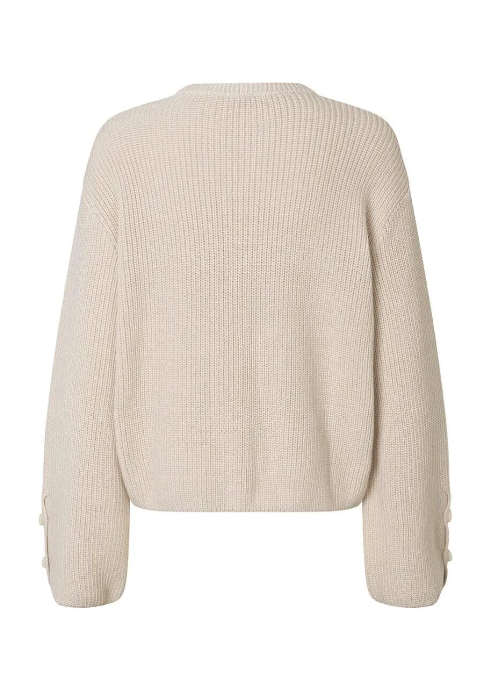 Striktrøje fra Modström i en varm cremefarve. Lavet af økologisk bomuld med en tydelig strikstruktur og knapper på ærmerne.