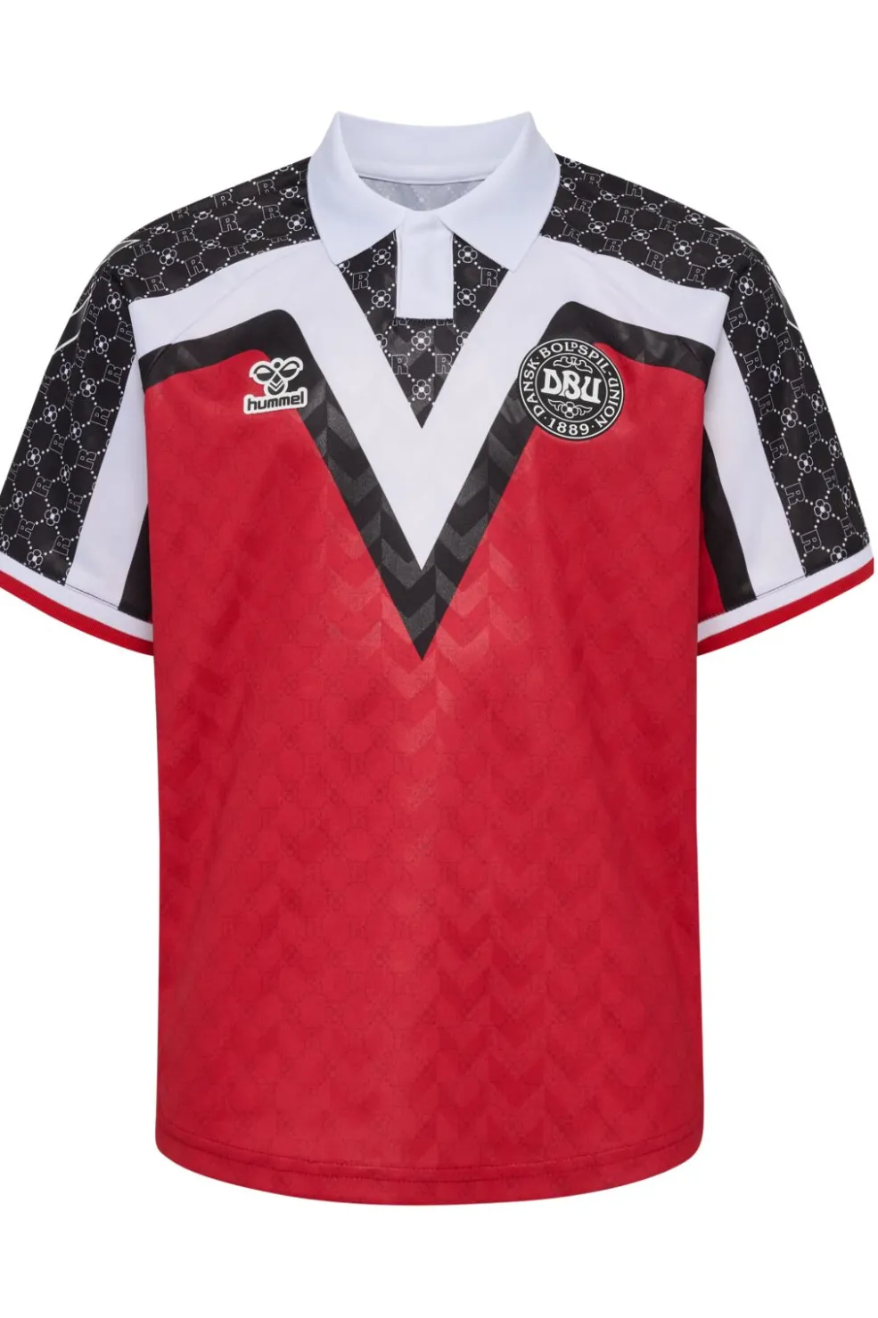Rød fodboldtrøje fra DBU x Rotate med V-formet mønster og hvid polokrave. Trøjen har DBU-logo på brystet og Rotate-branding på ryggen.
