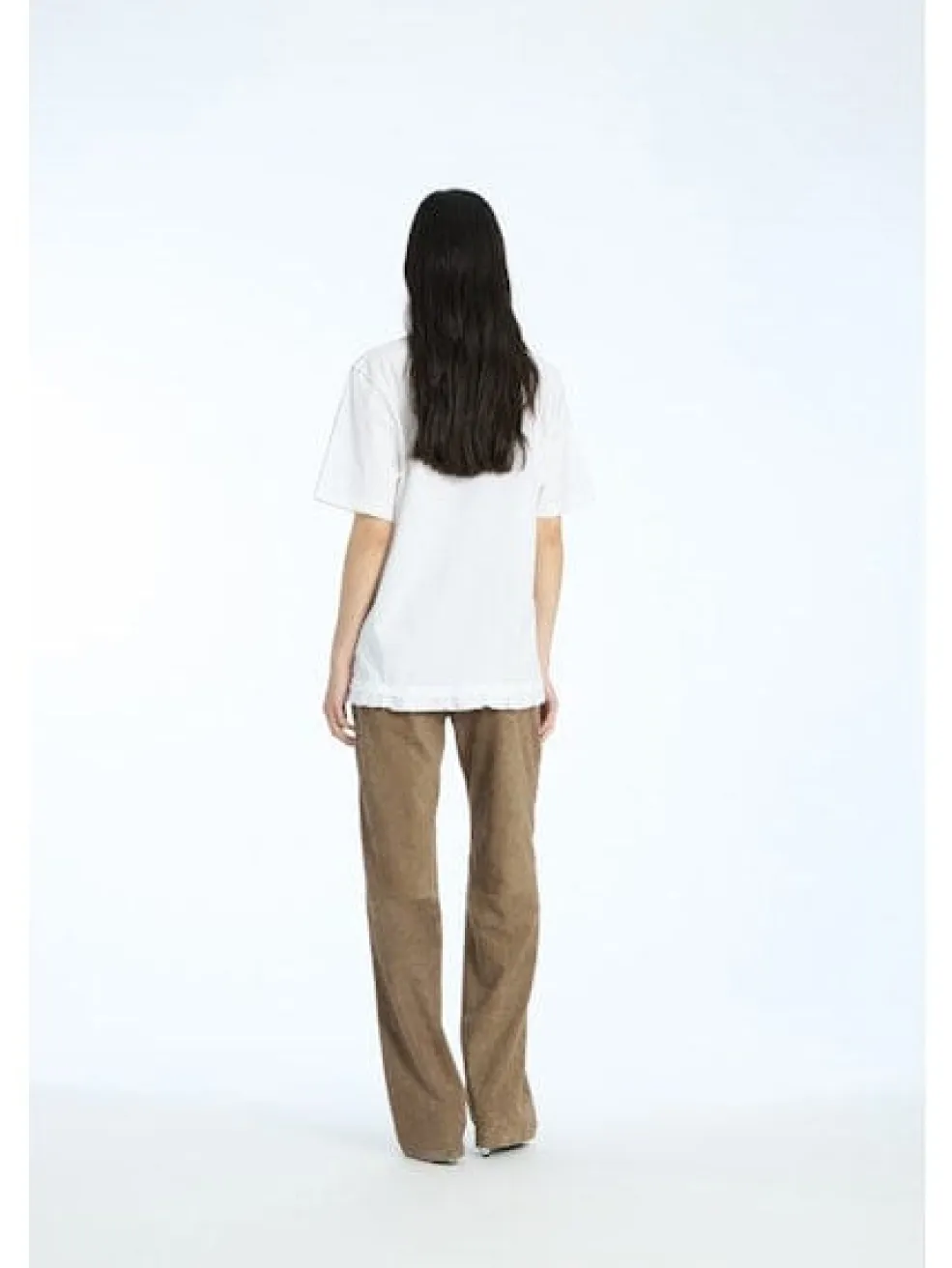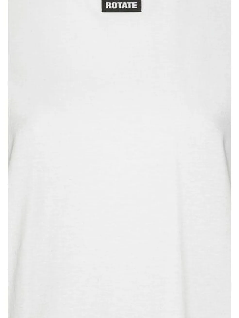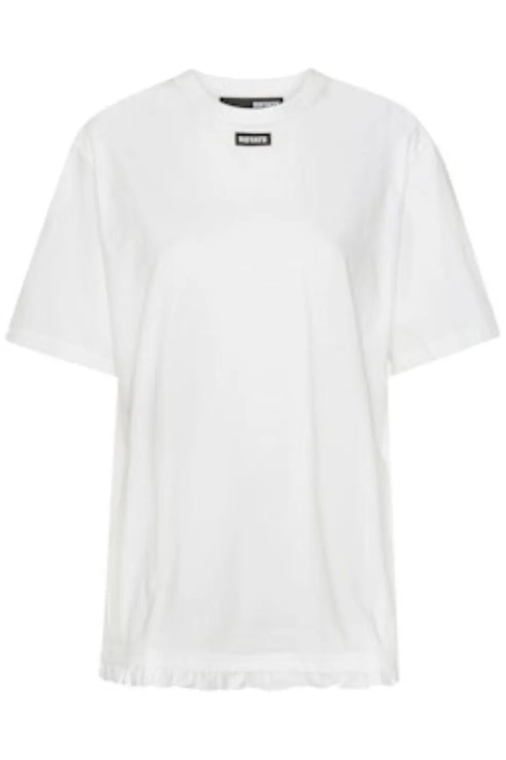 Hvid oversized T-shirt fra Rotate med rynkekant nederst. T-shirten har korte ærmer og en rund halsudskæring.